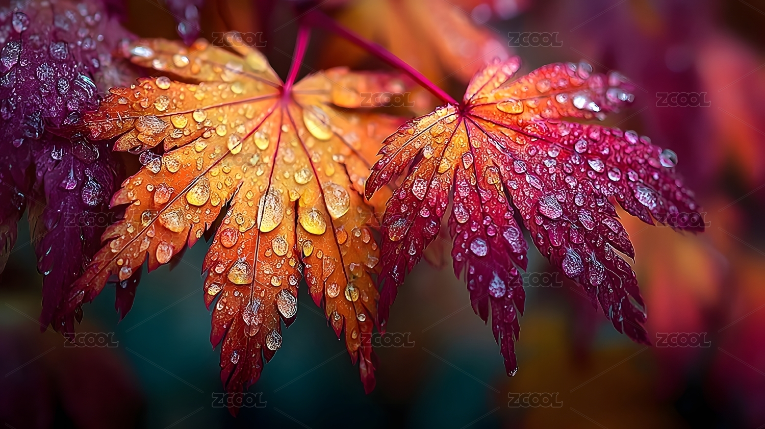 多彩秋叶露珠特写