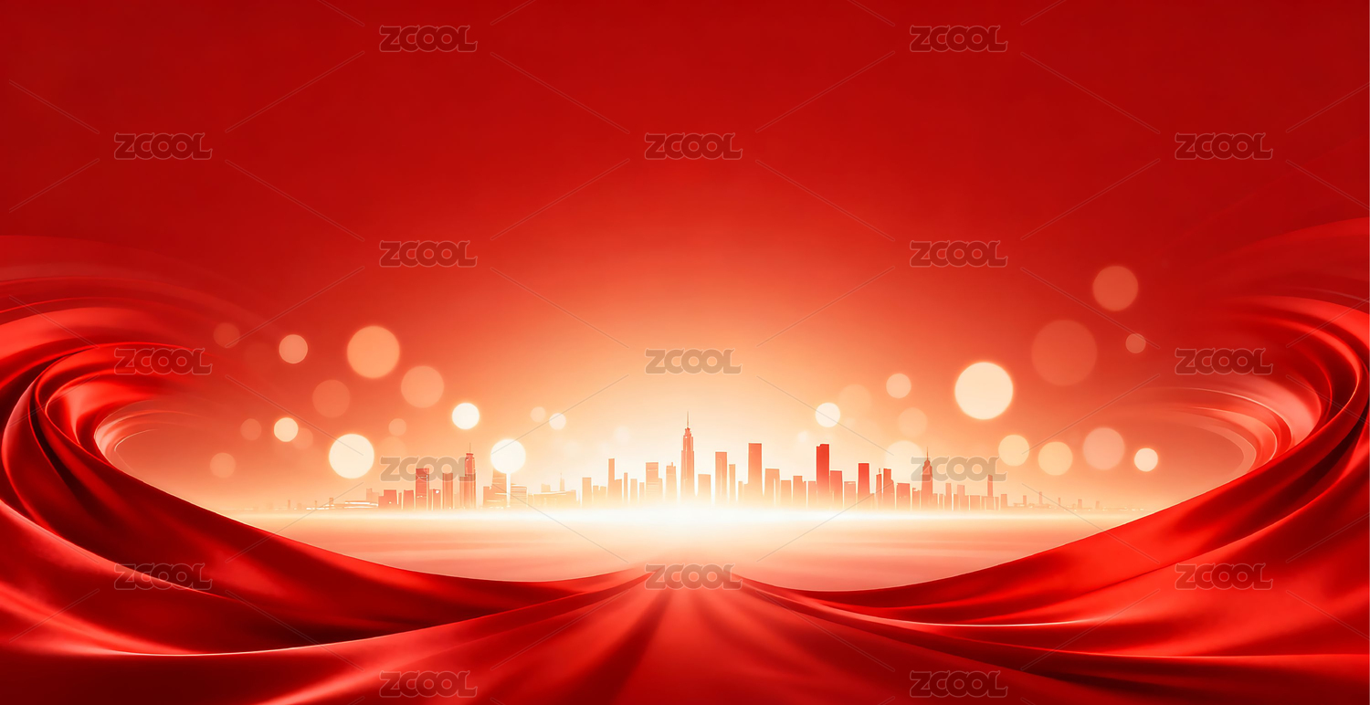红金色绸缎布料城市建筑天际线商务庆典背景