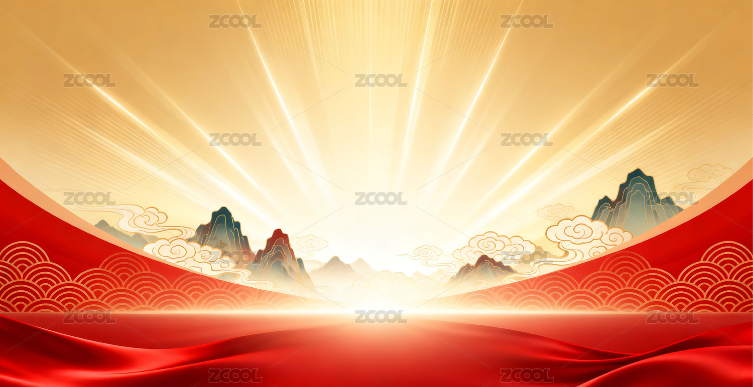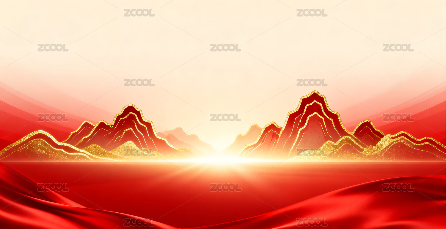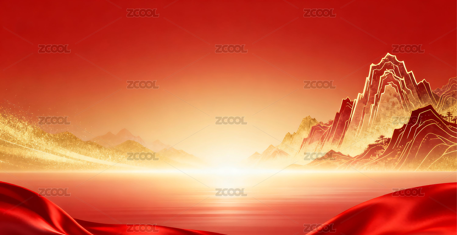 红金色绸缎布料中式山水天际线商务庆典背景