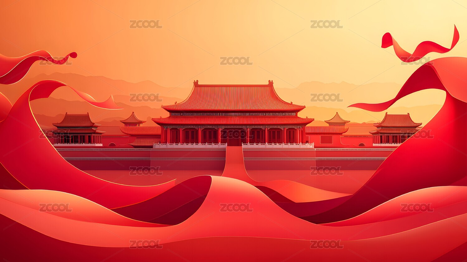 国潮红金色古建筑背景幕