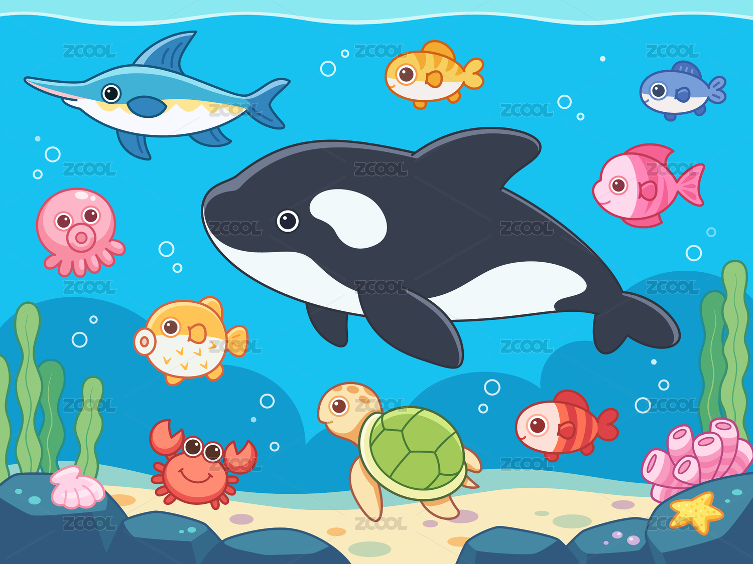 海洋,动物,卡通,插画,水母,海龟,鲸鱼,章鱼,小鱼,水草