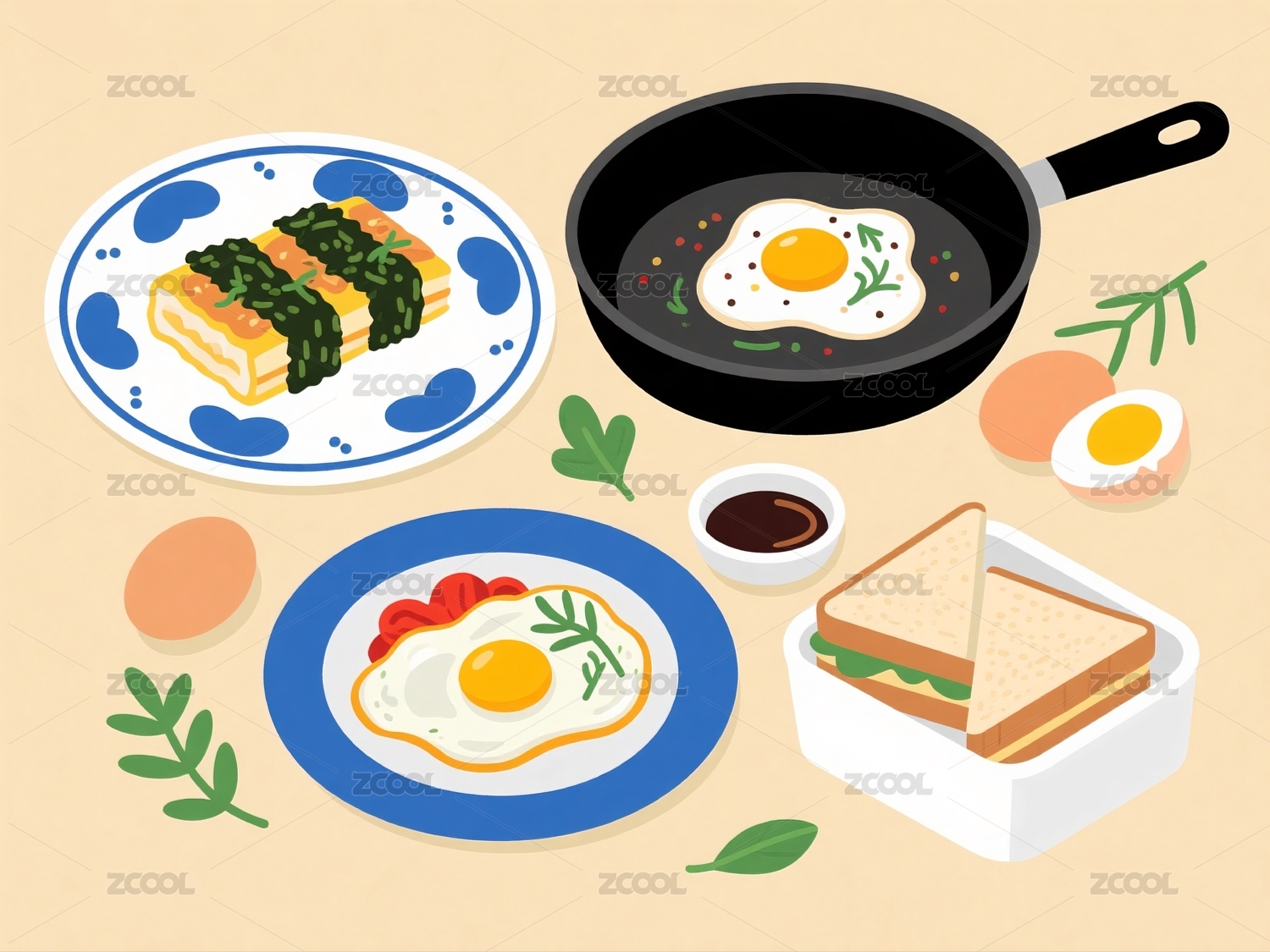 煎蛋,煎饼,煎锅,早餐,美食,插画,番茄,罗勒,浆果,烹饪