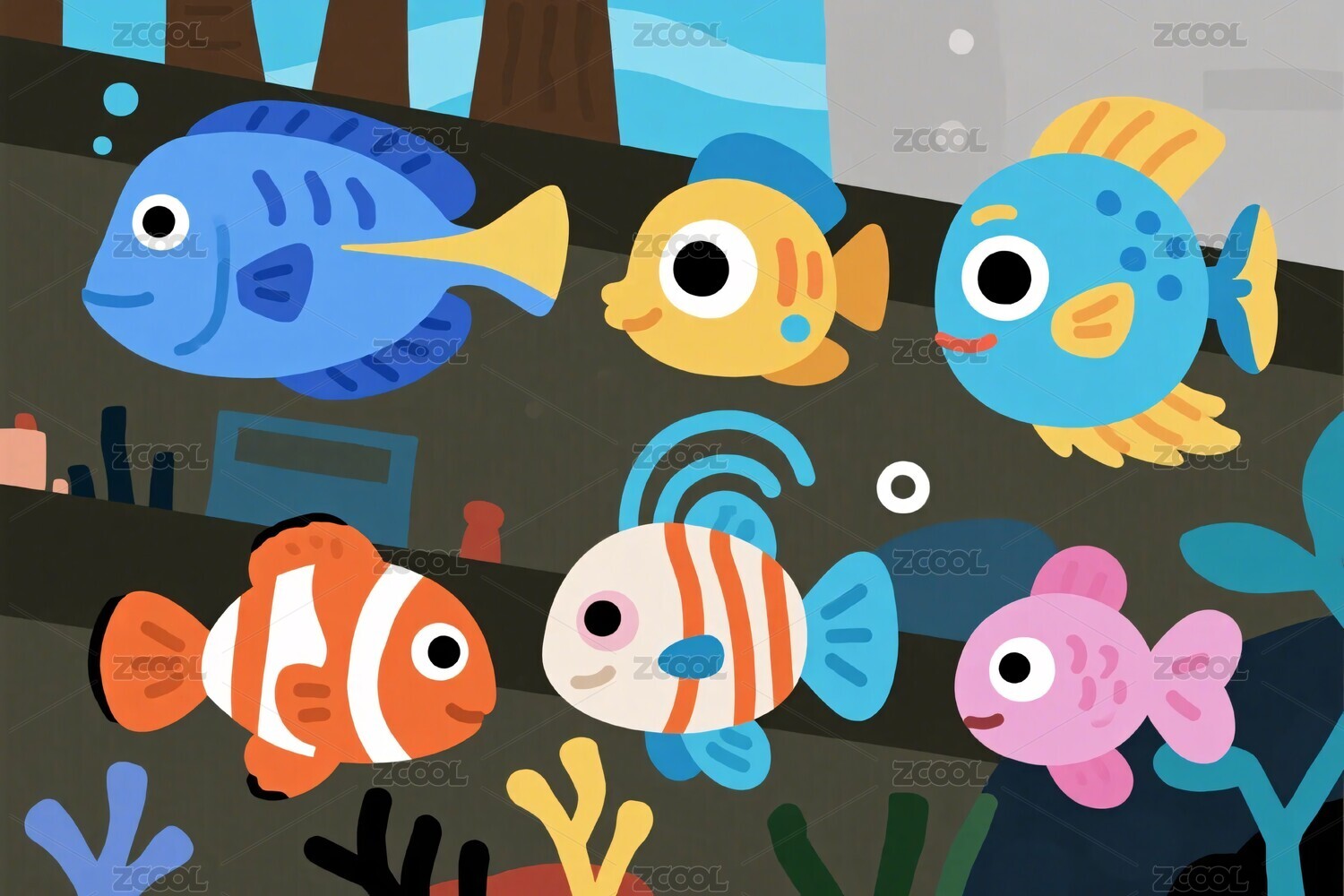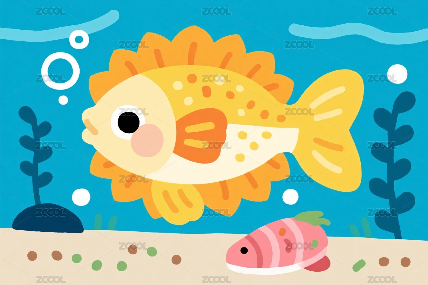 卡通鱼与水下植物插画