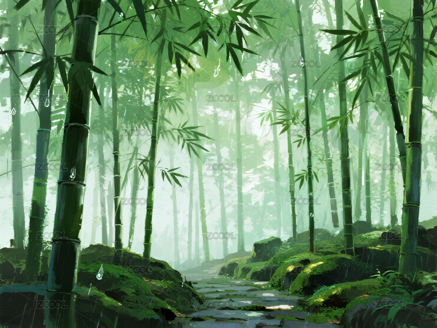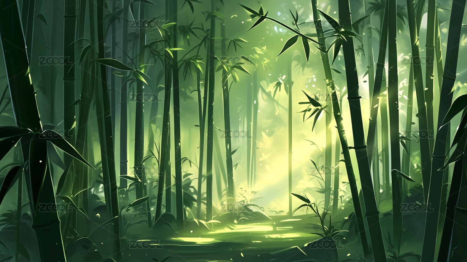 竹林,小径,风景,插画,自然景观,绿色,光影,竹笋,静谧,生态
