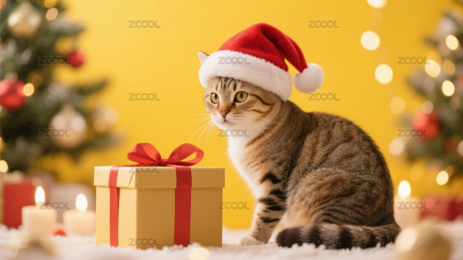 猫咪,圣诞帽,礼物盒,雪景,圣诞树,圣诞,冬季,插画,宠物,可爱