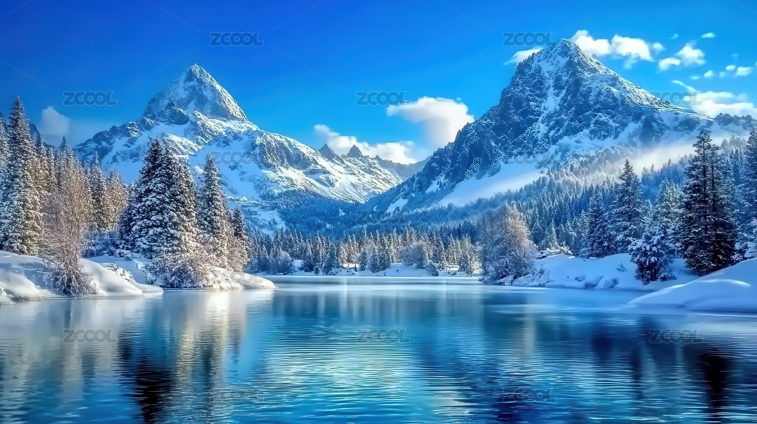 雪景,山水,湖泊,雪山,树木,森林,自然,风景,插画,雪地
