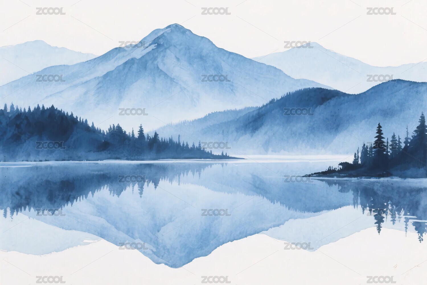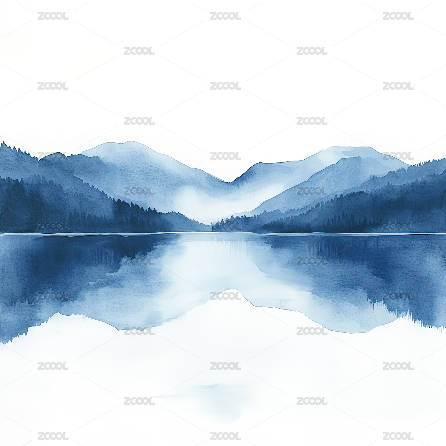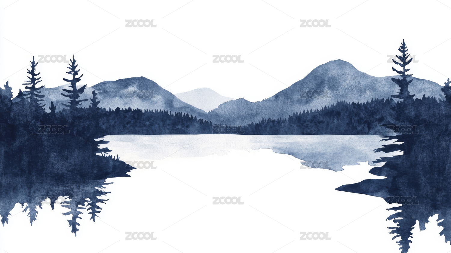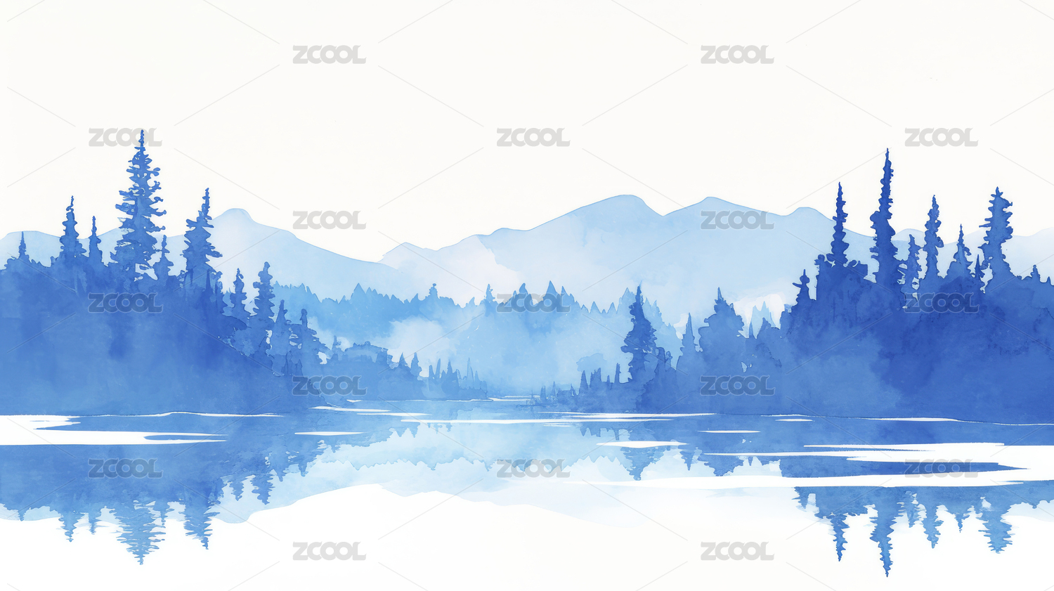 山水,风景,水彩,插画,山水画,自然,湖泊,树木,蓝色,水彩画