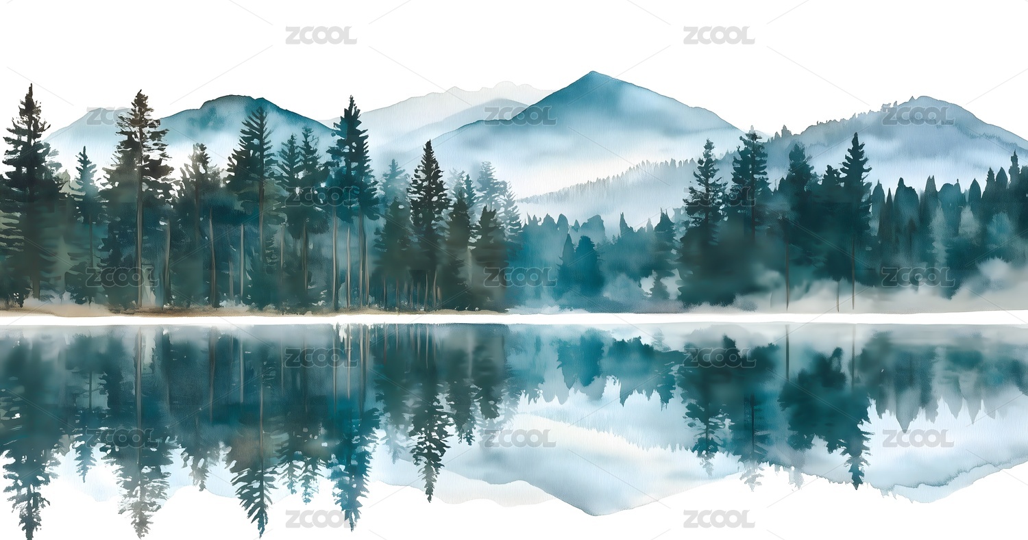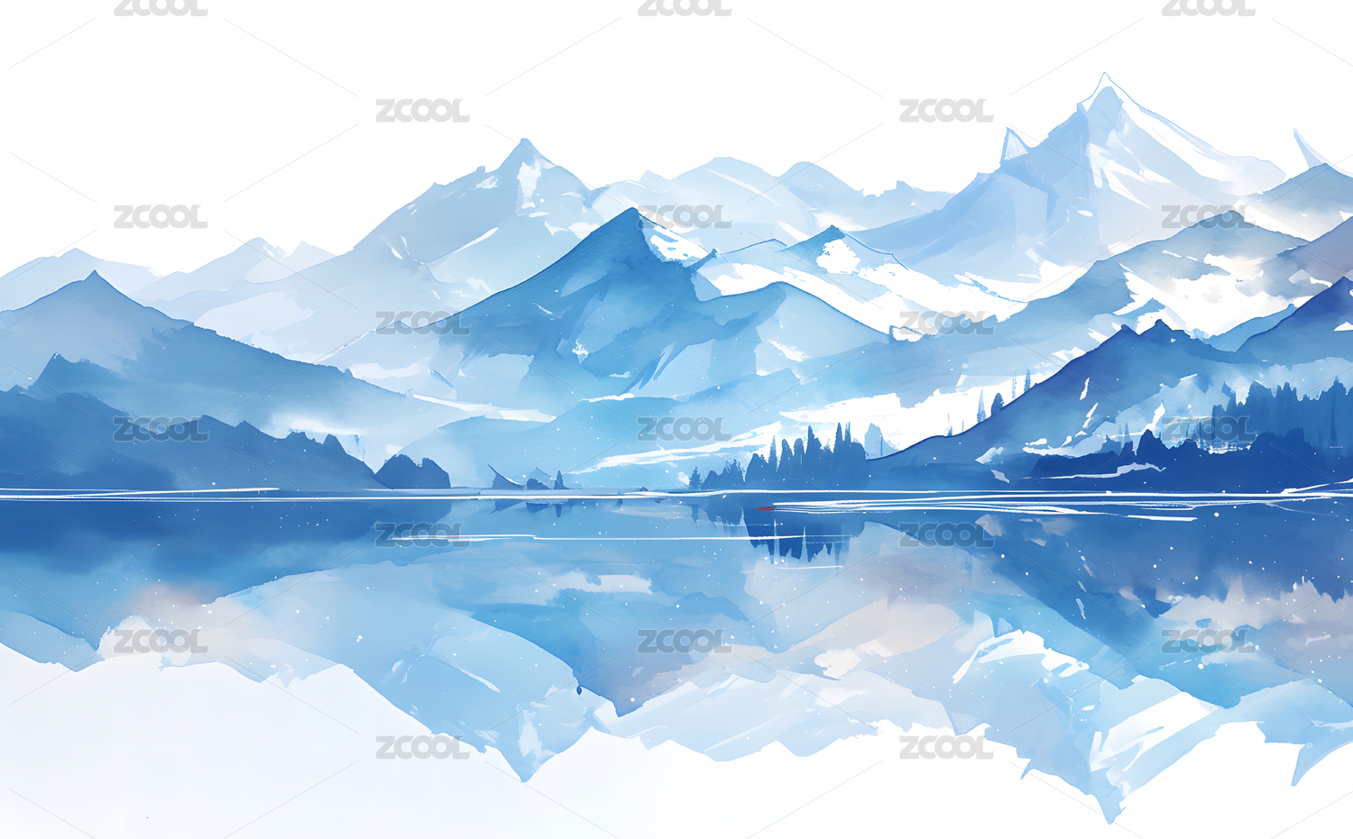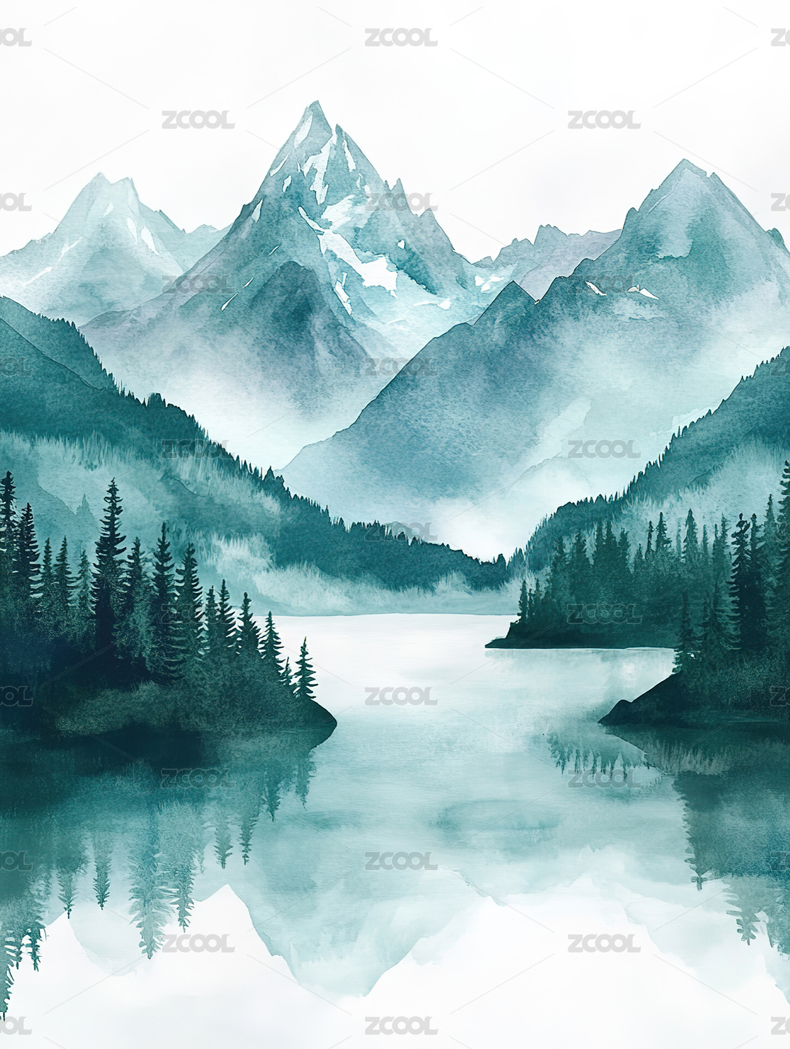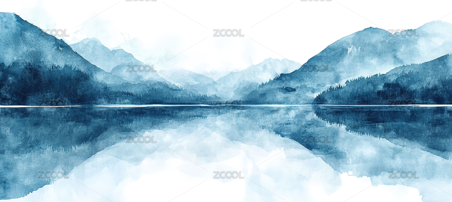 山水,风景,水彩,插画,山水画,自然,湖泊,树木,蓝色,水彩画