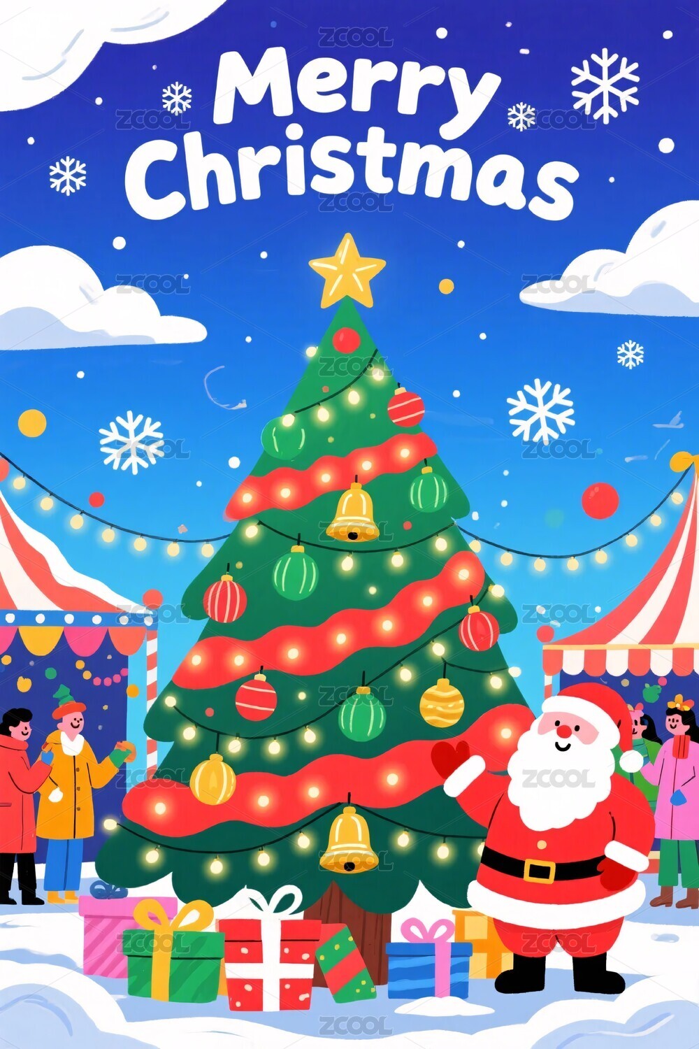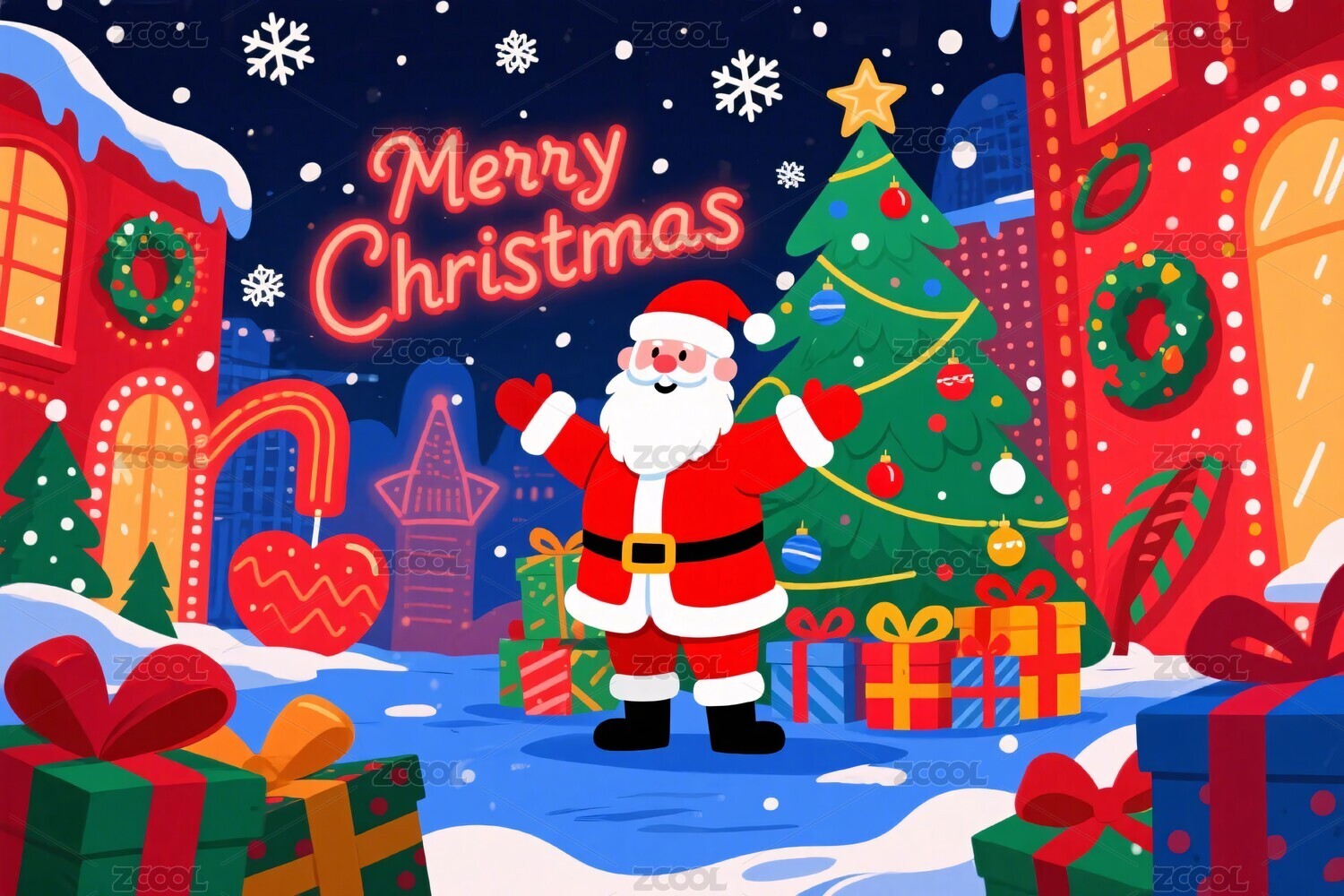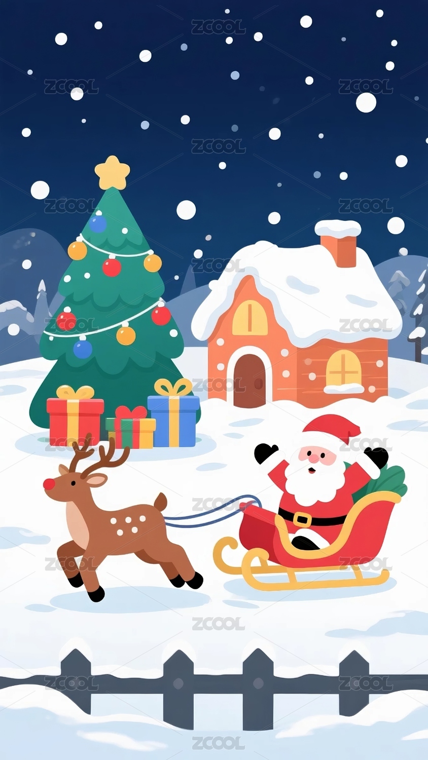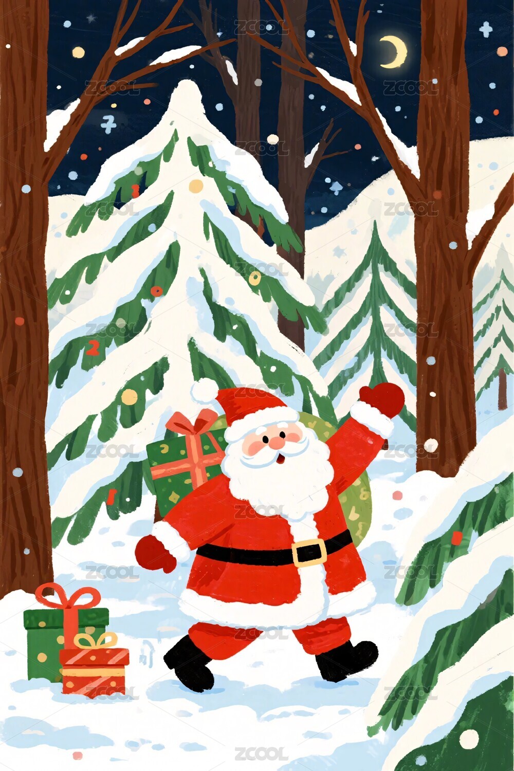 圣诞老人,圣诞树,驯鹿,雪橇,礼物,雪人,圣诞袜,星星,雪花,森林