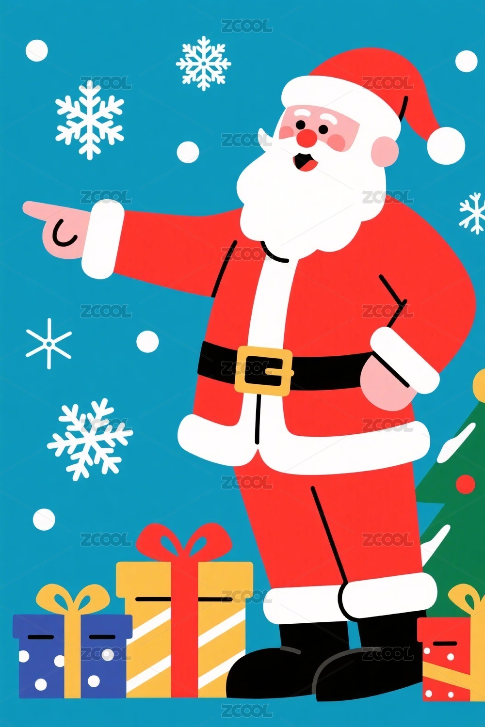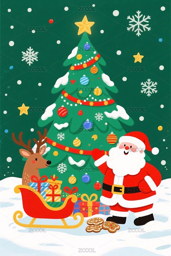 圣诞树,圣诞老人,驯鹿,雪橇,礼物,雪花,星星,装饰,插画,模板