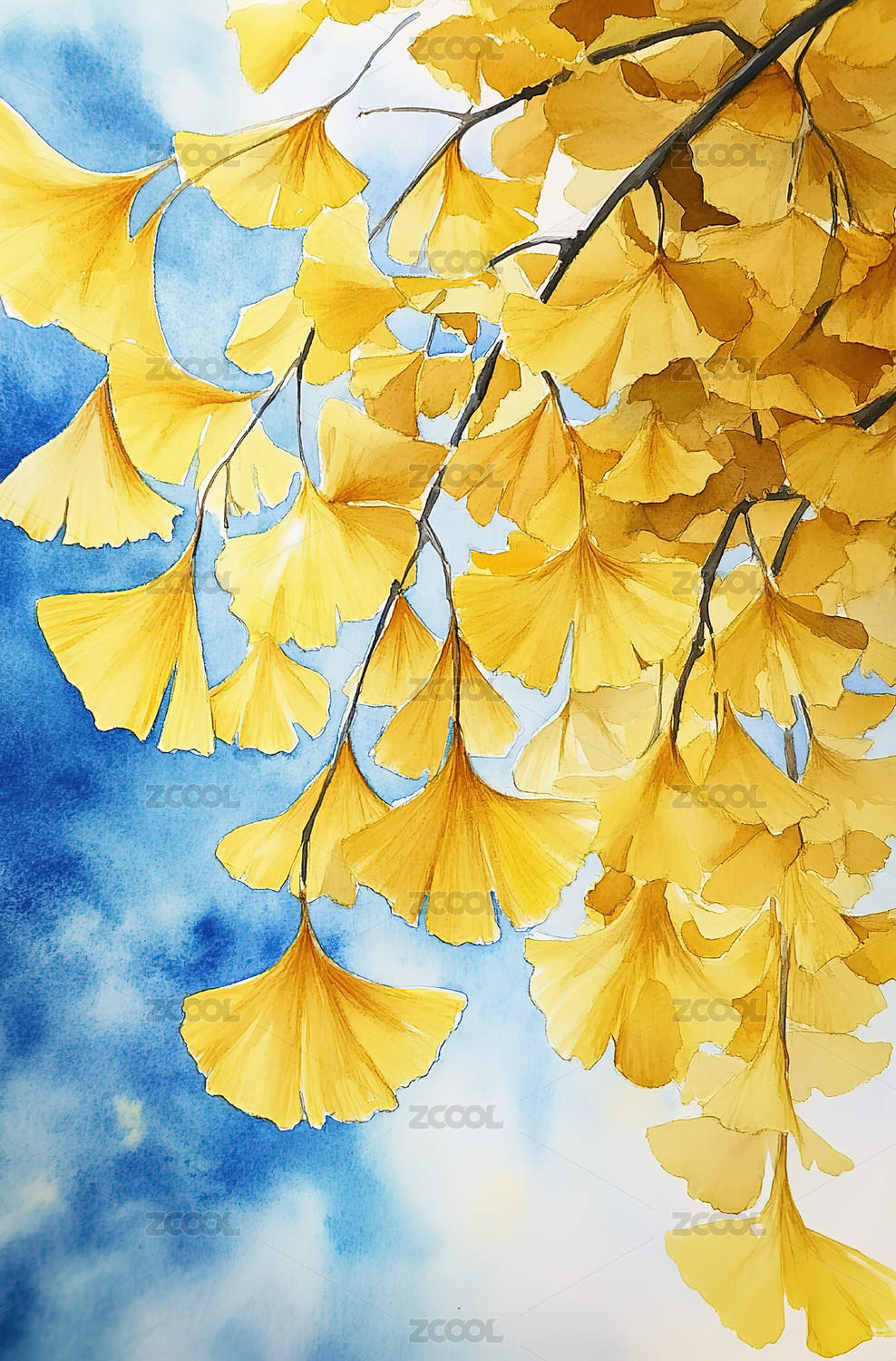 简单纯色背景散落的银杏叶和枝条 手绘插画