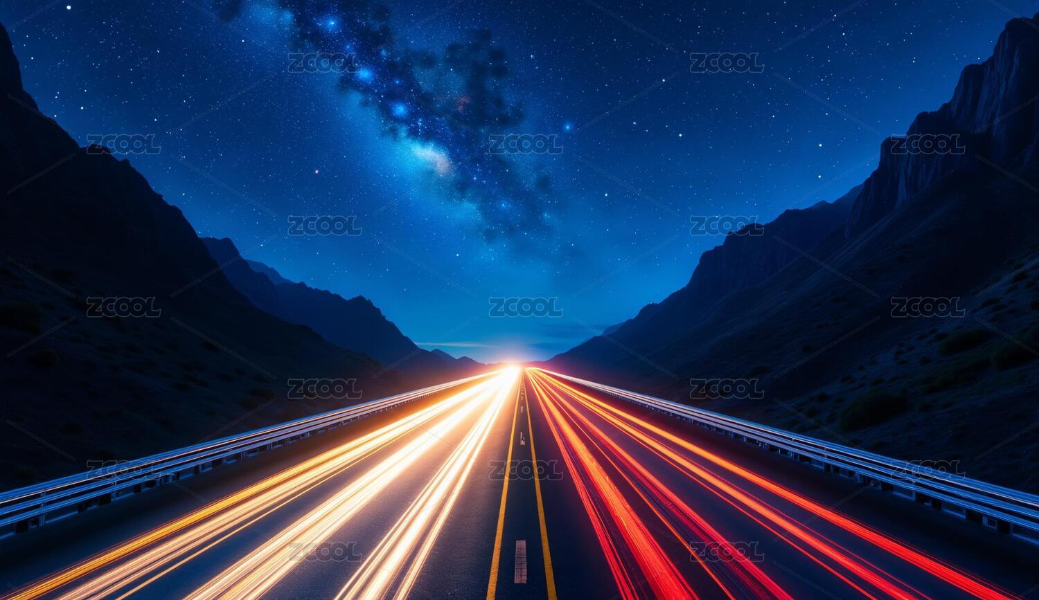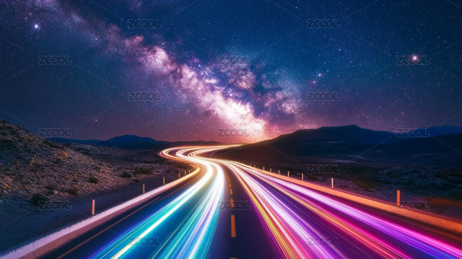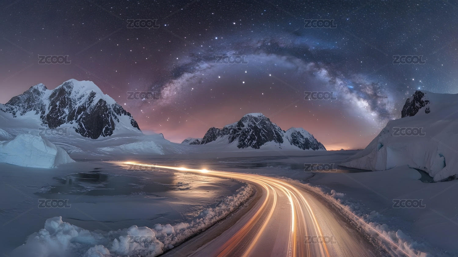 未来感,科幻,光影,雪山,公路,夜景,星轨,光效,自然,景观