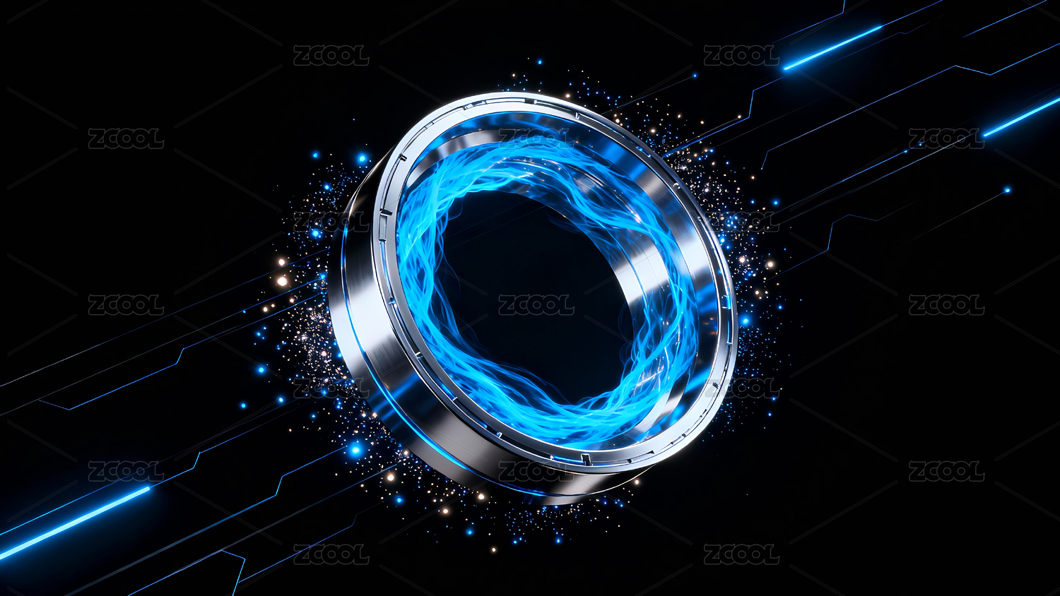 蓝色背景下发光圆环与光带图案