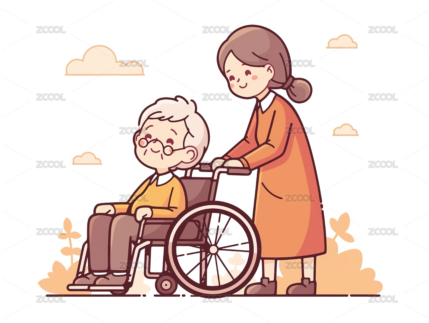 医院护士推着老年病人护理老年人 可爱风格重阳节插画