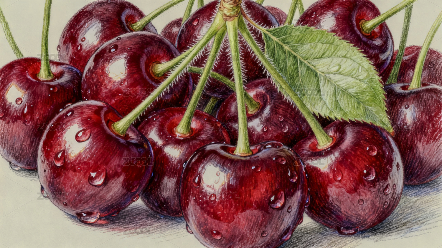 红润樱桃枝头娇艳欲滴,唯美静物绘画