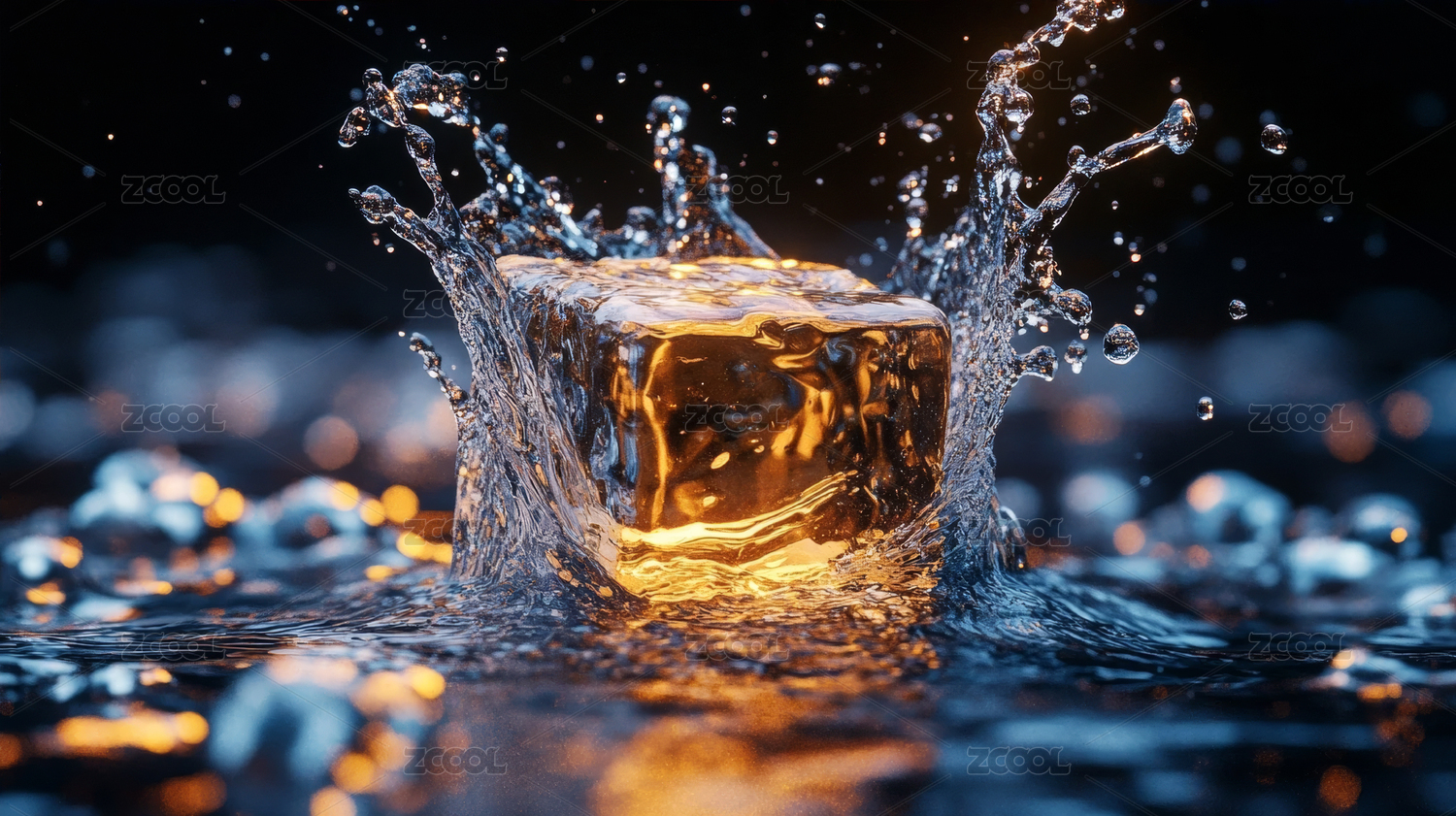 冰块,透明,落入,水中,溅起,水花,金色,光线,反射,清凉