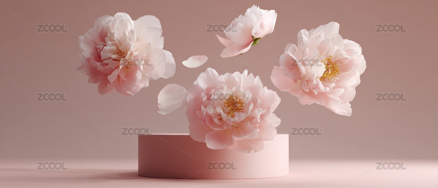 粉色牡丹花在柔和背景中漂浮的唯美场景