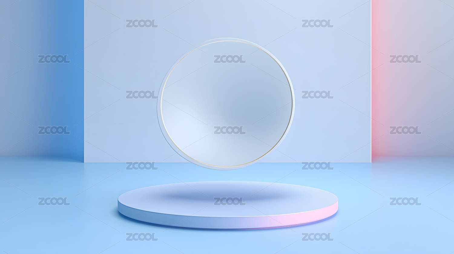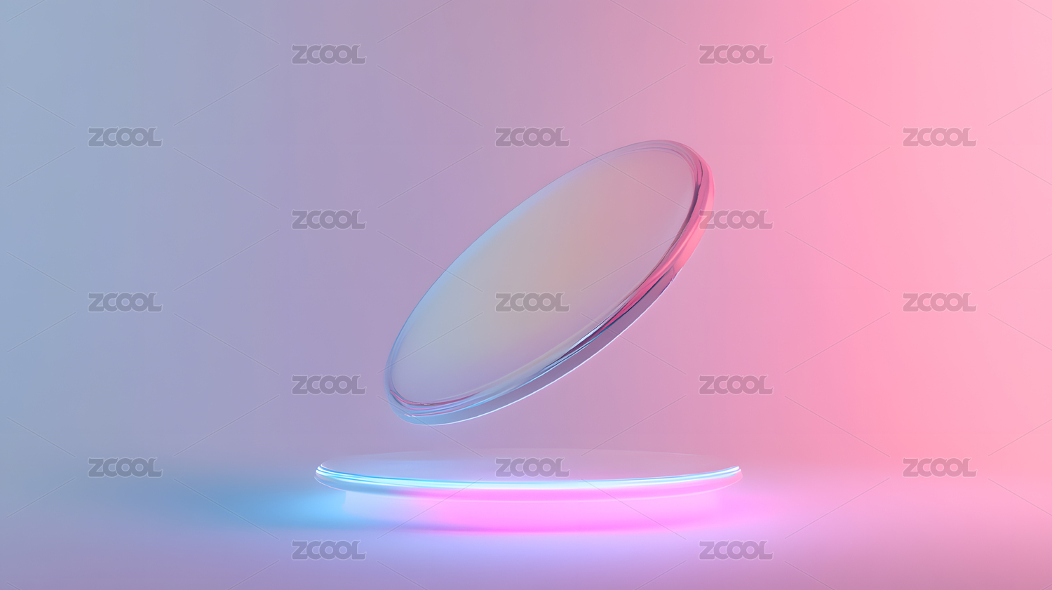 粉色蓝色梦幻背景下悬浮透明圆盘