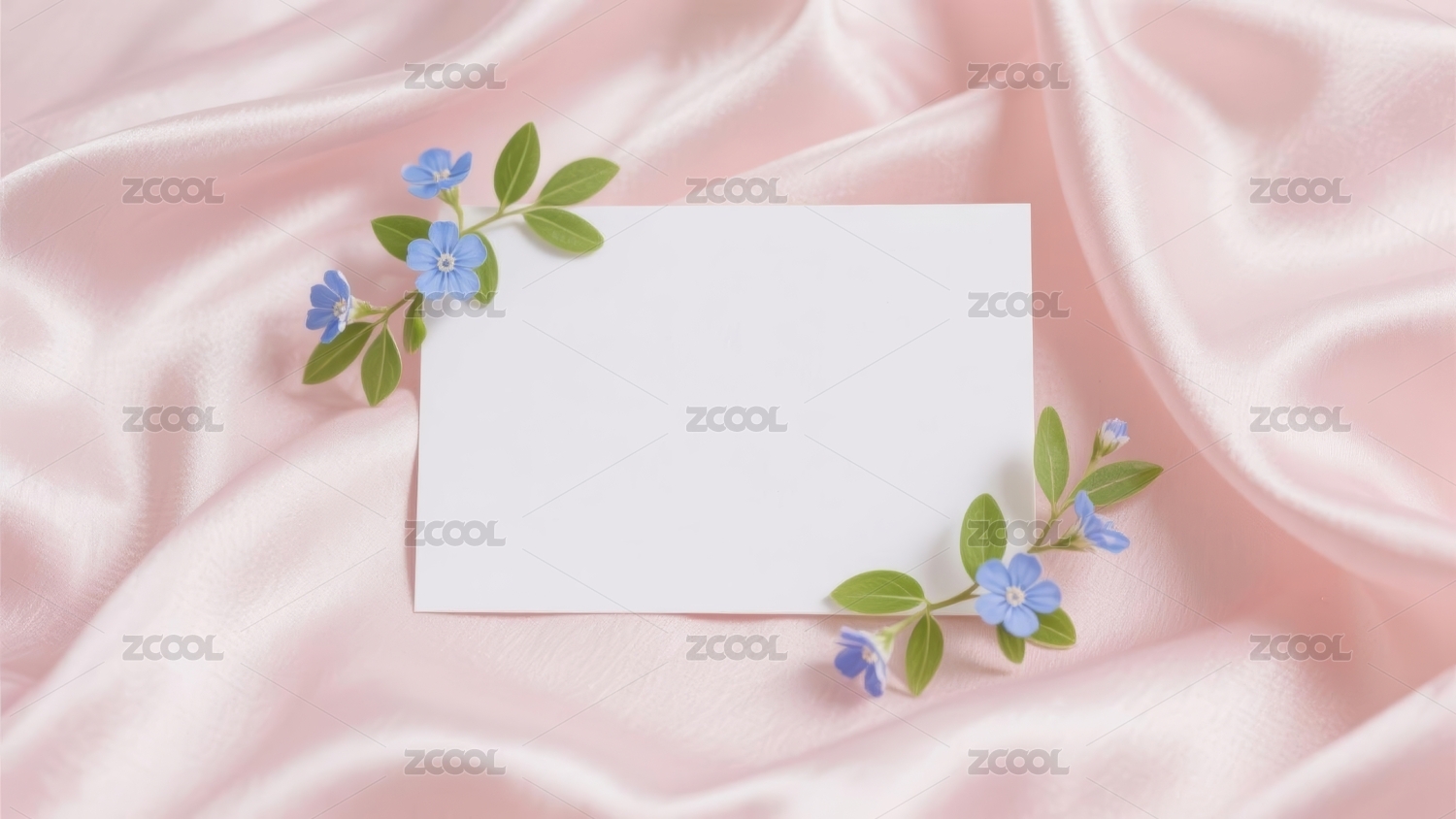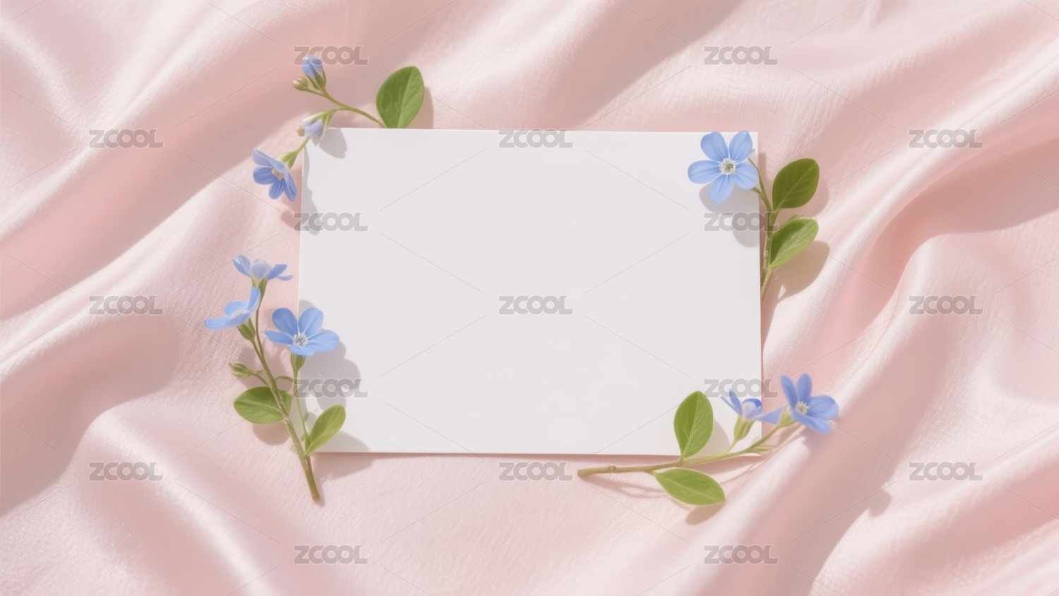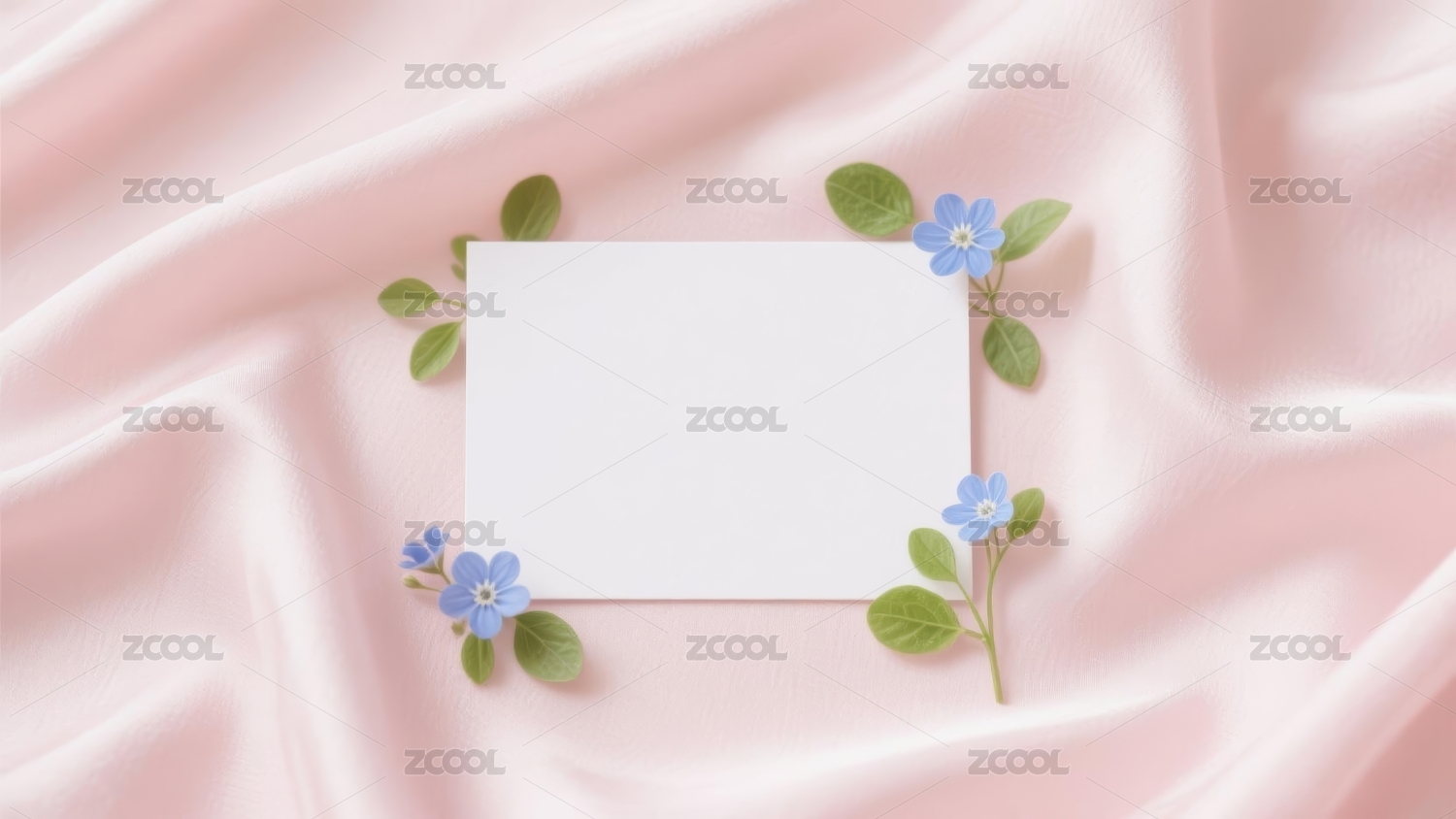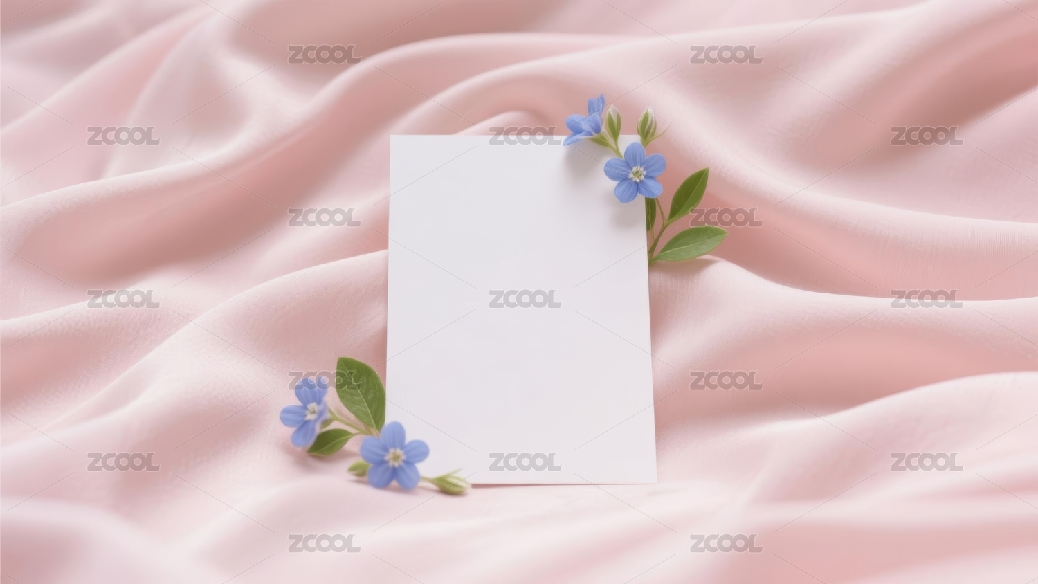 浅蓝色布料上的白色卡片静物摄影高清图片