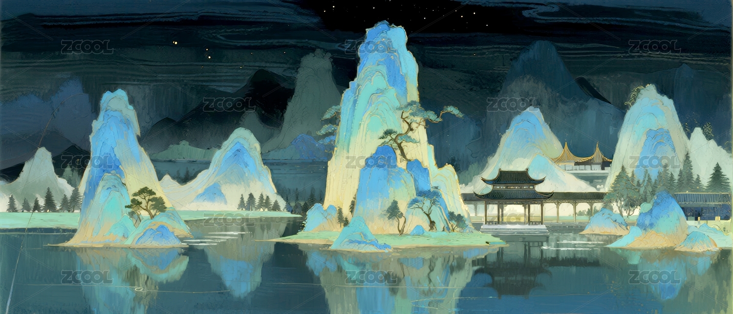 山水古建月夜感商业壁纸设计场景