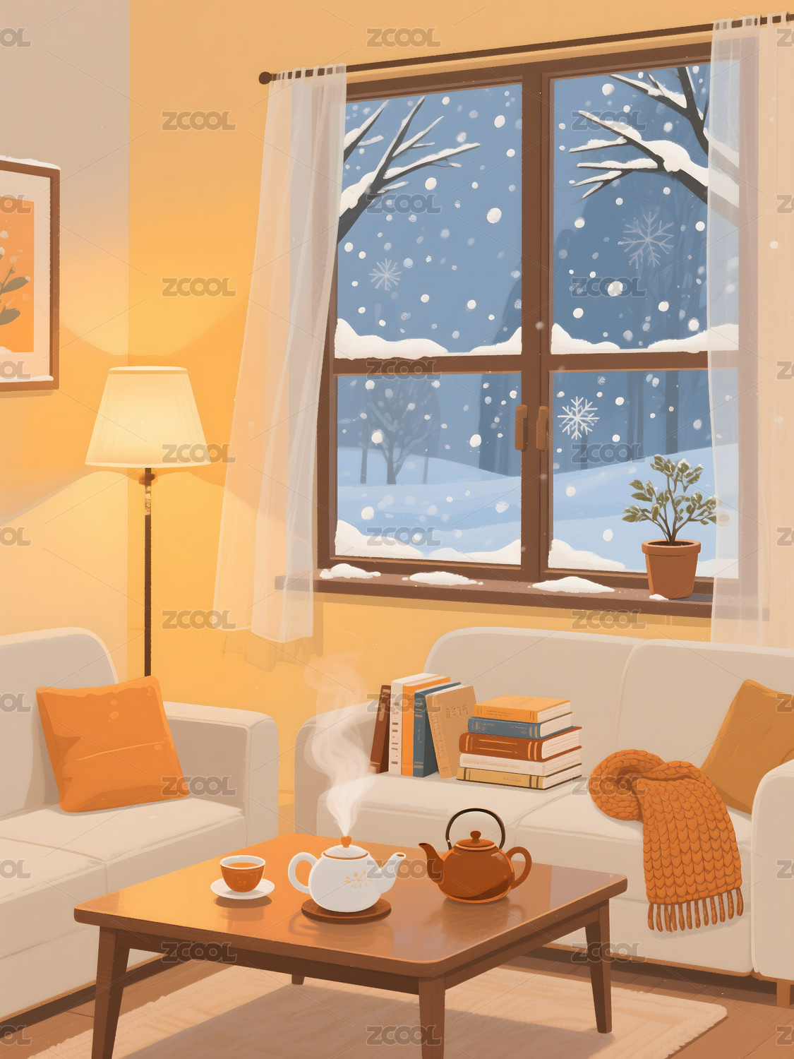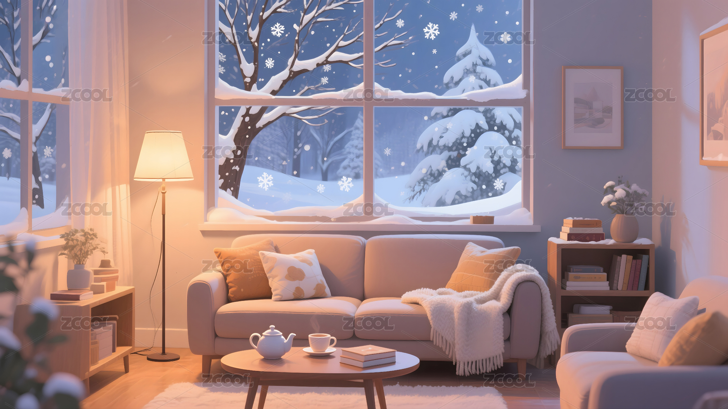 冬日,雪景,室内,温馨,舒适,家居,客厅,窗外,雪花,宁静