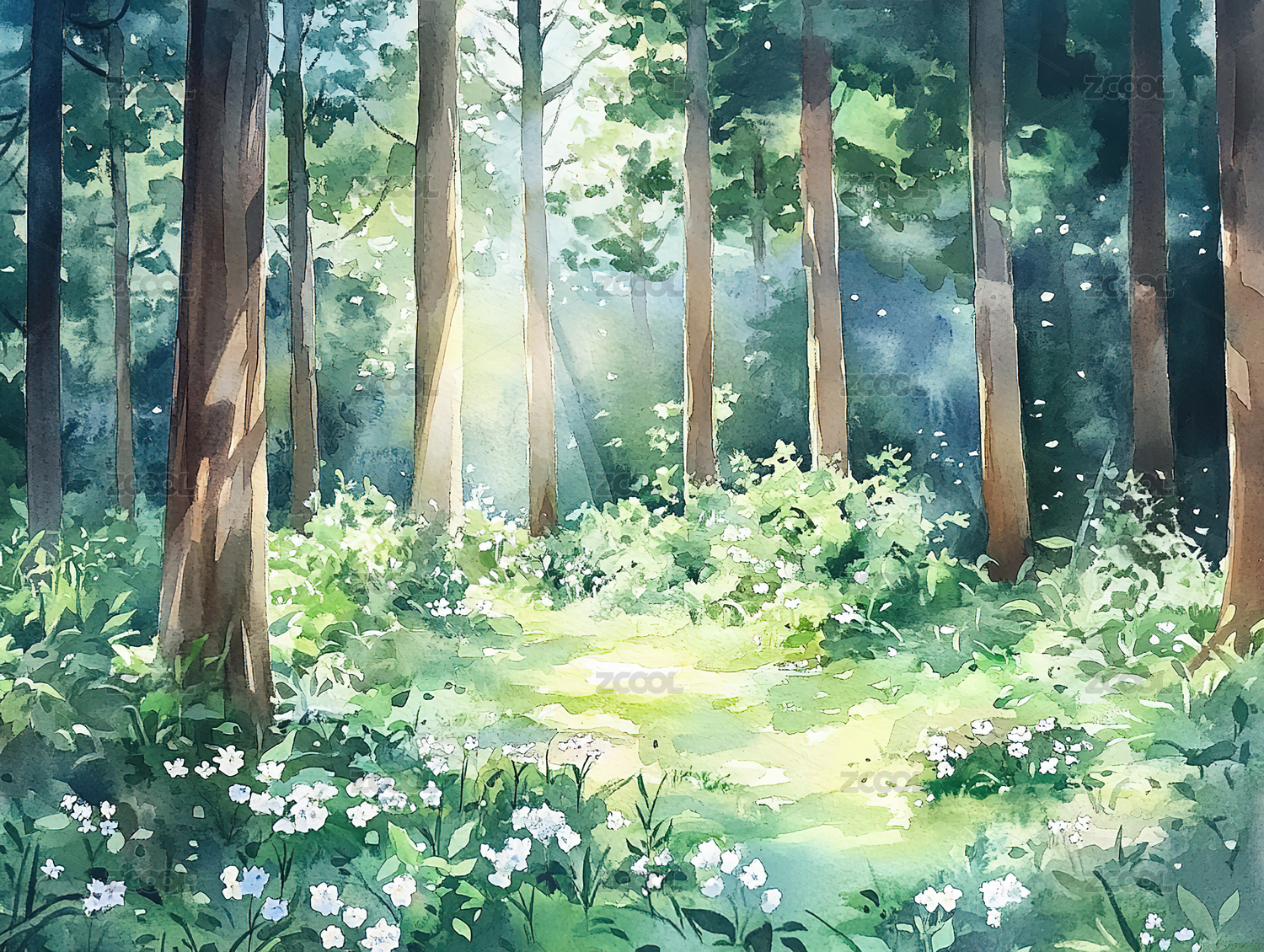 森林,树木,绿色,自然,水彩,绘画,艺术,树林,光影,植被
