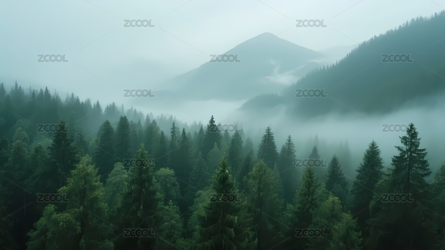 浓雾笼罩着绿色茂密的森林,令人惊叹的早晨