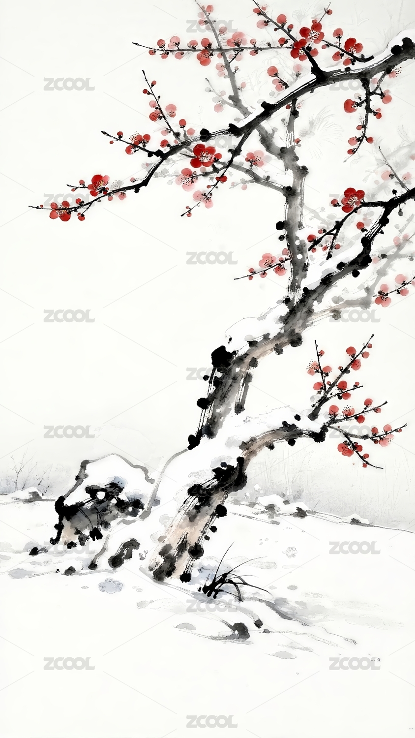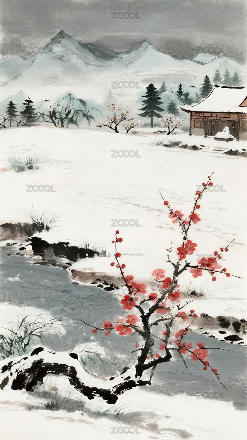 红梅,雪景,鸟,中国风,水墨画,冬日,报春,傲雪,枝头,山水