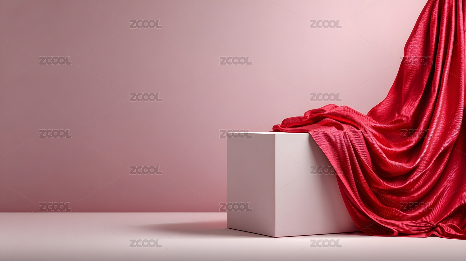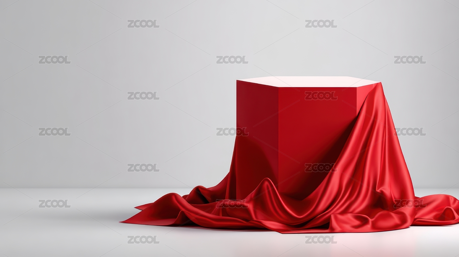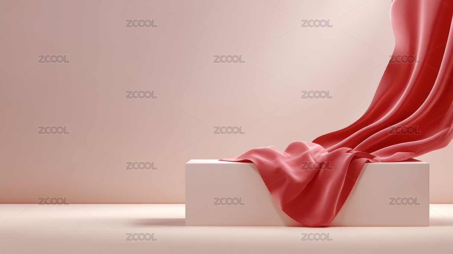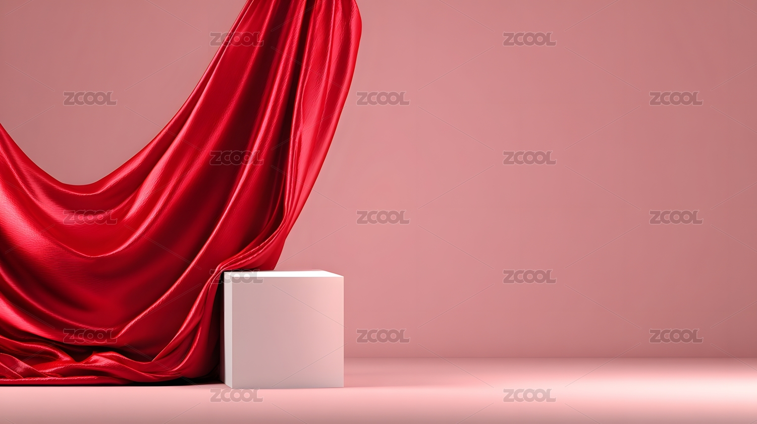 红色丝绒布料轻覆白色展台的简约艺术场景