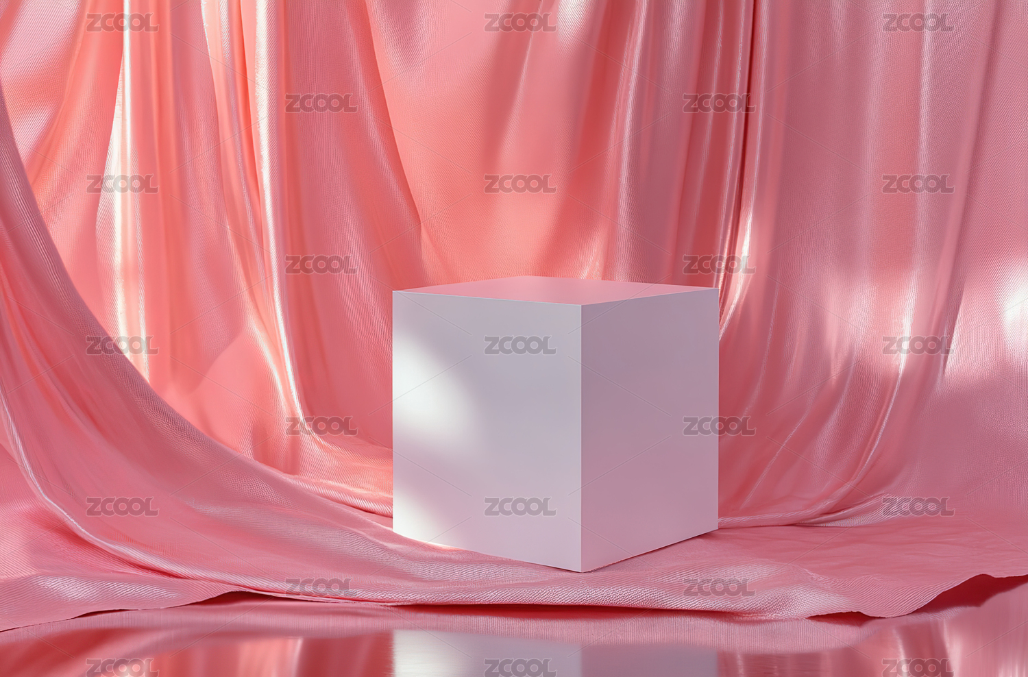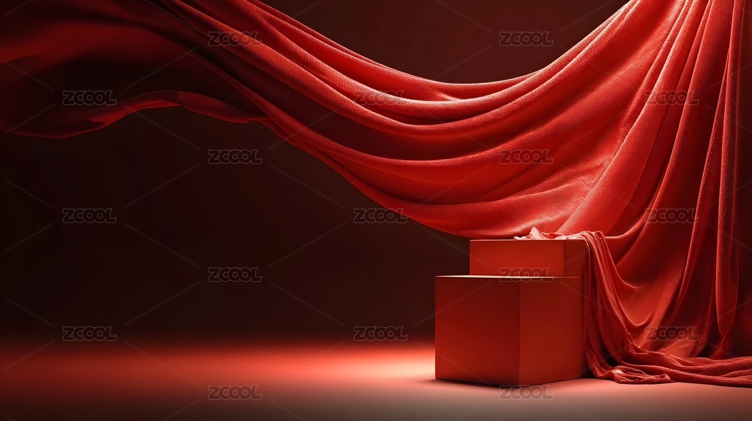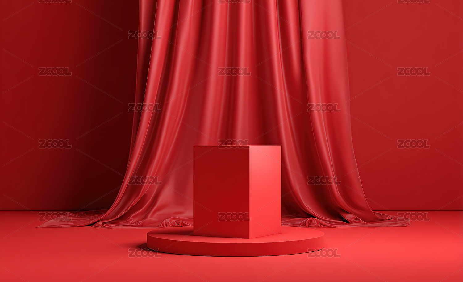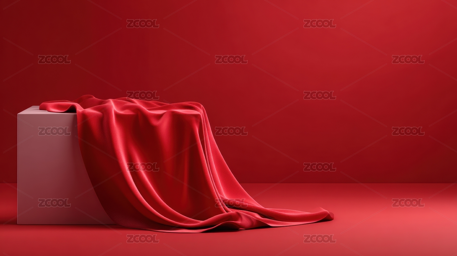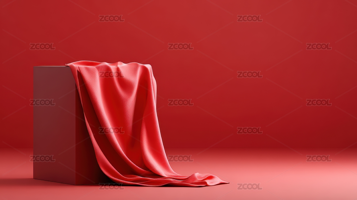 红色丝绒布料轻覆白色展台的简约艺术场景