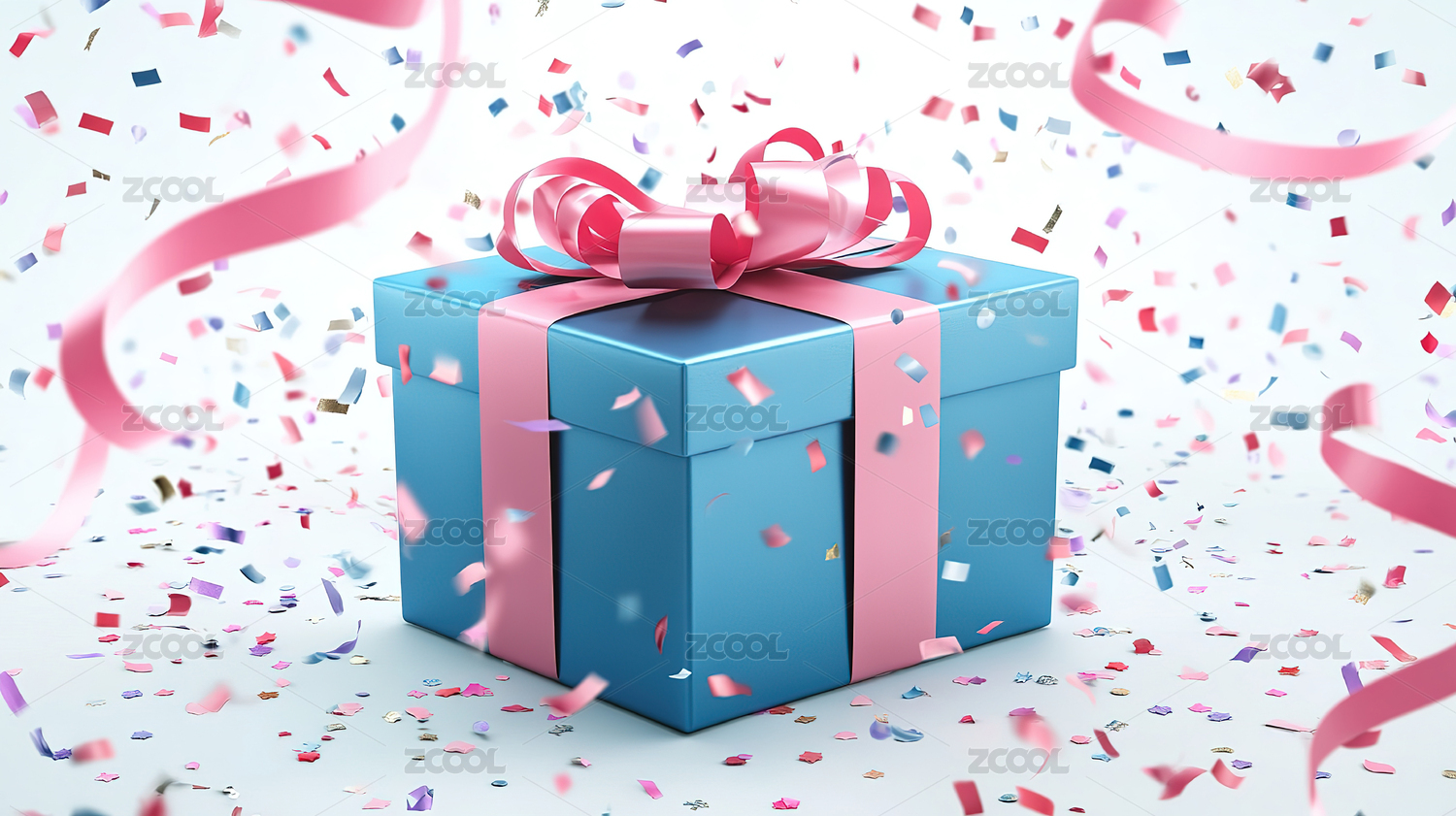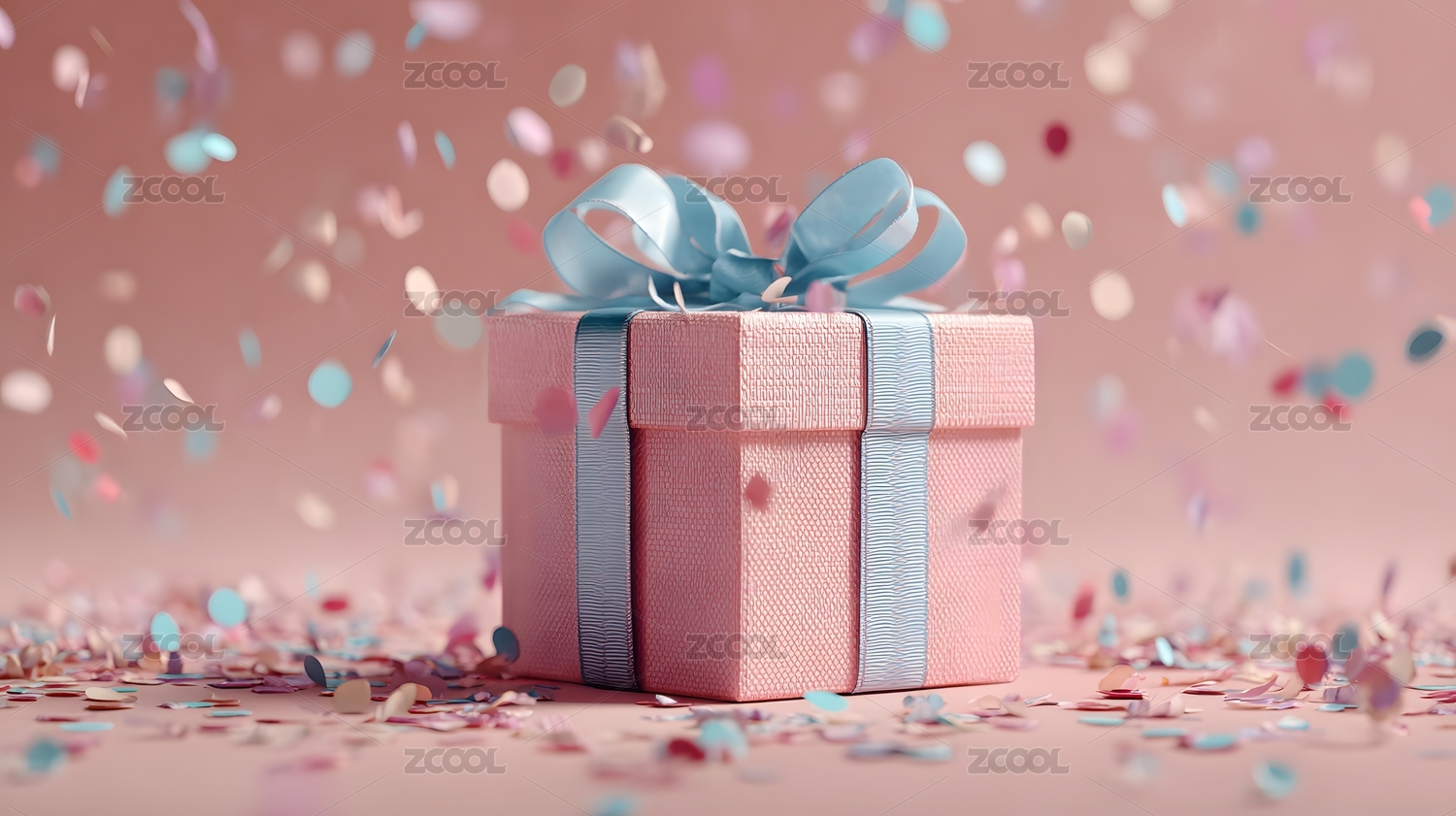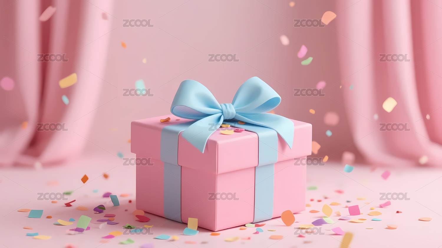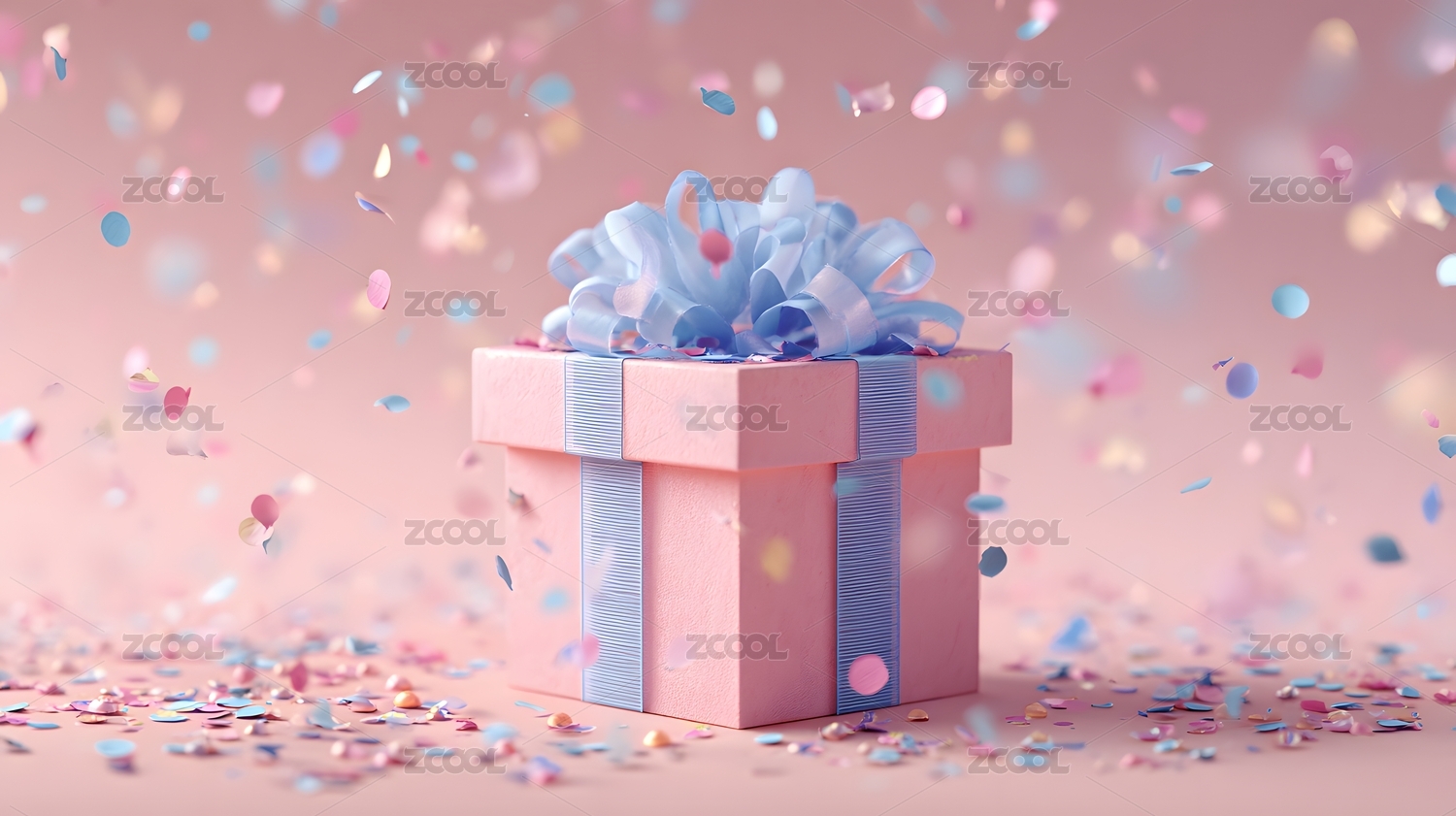 粉色礼物盒与蓝色丝带飘落彩色纸屑