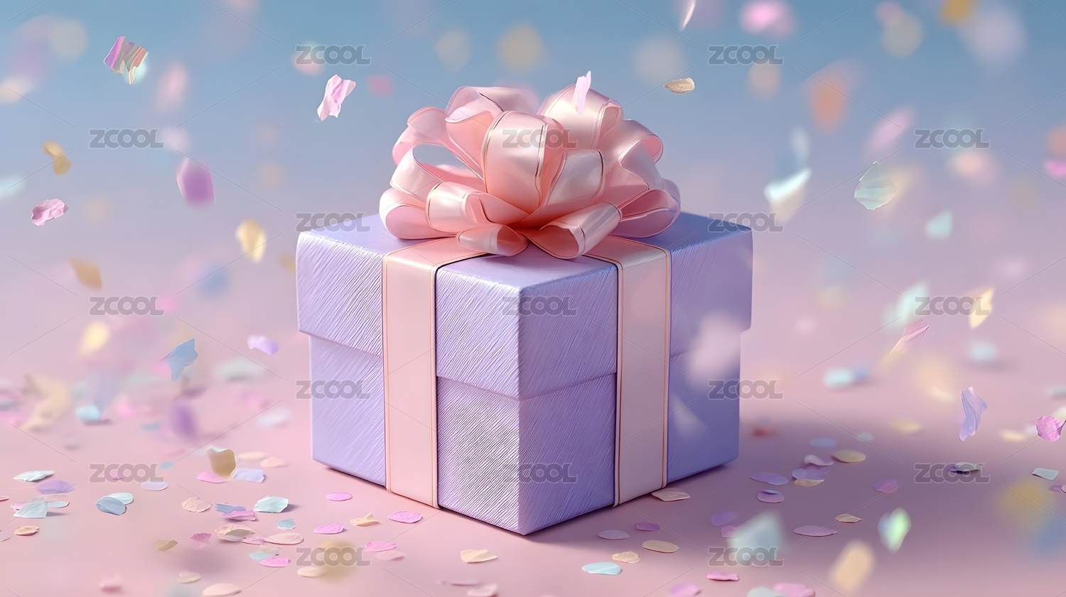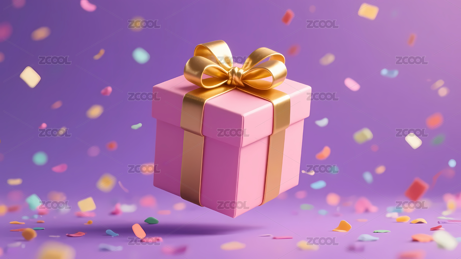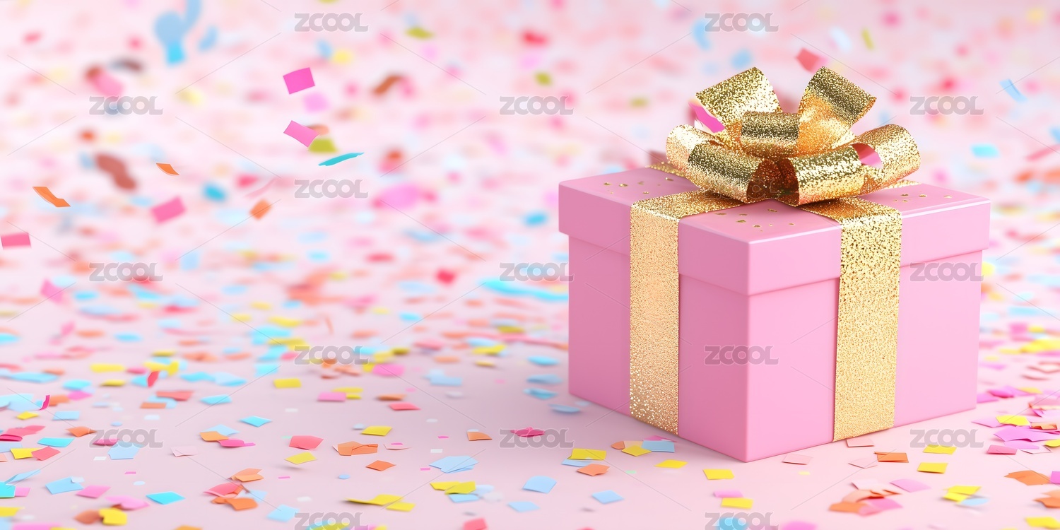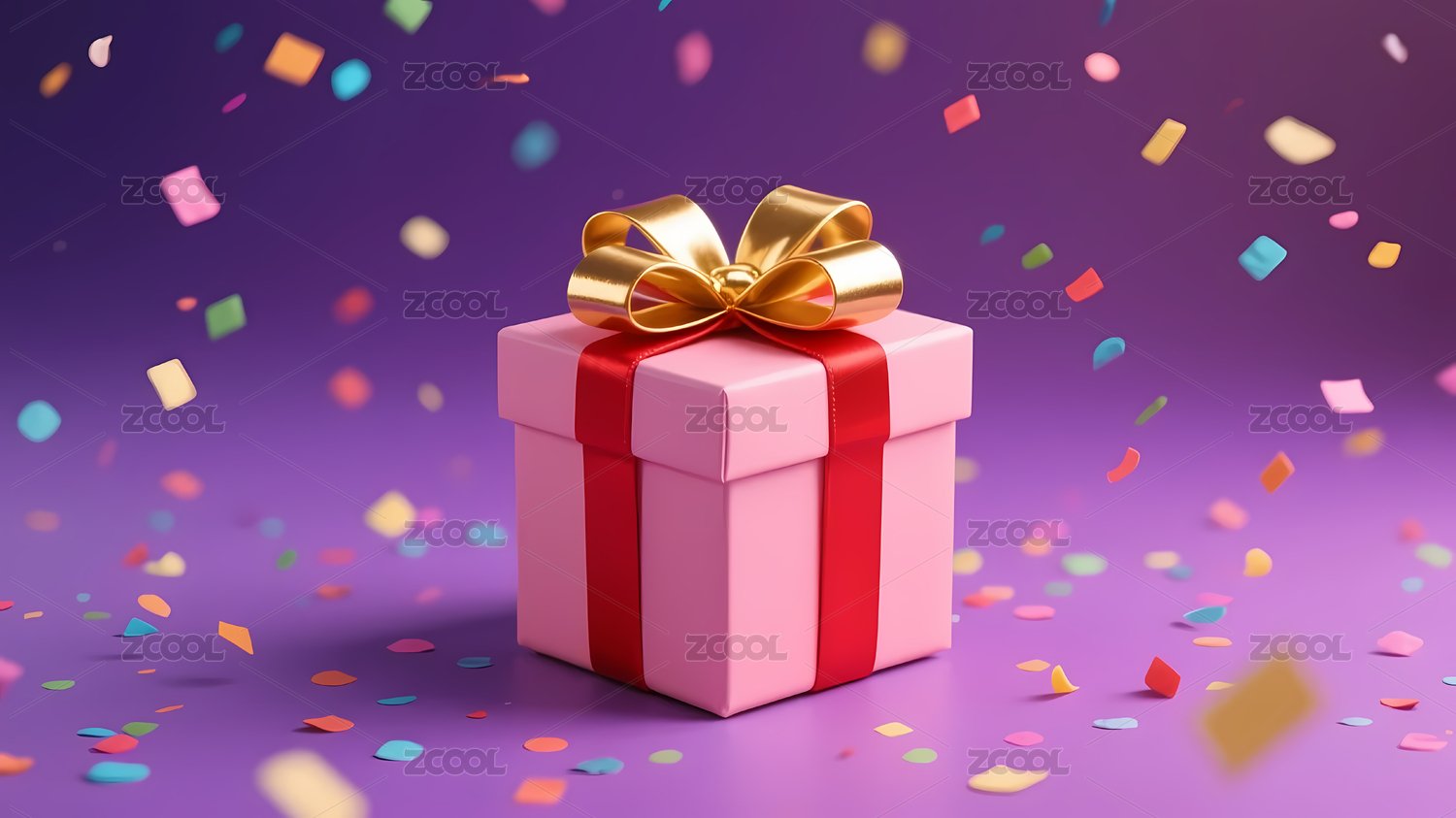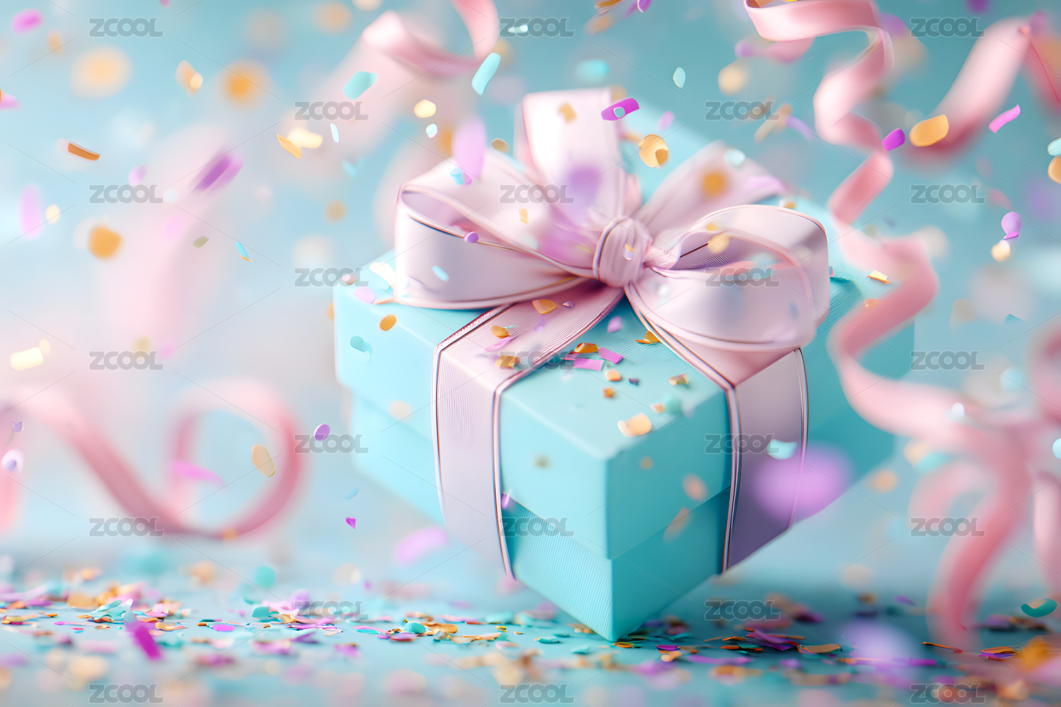 粉色礼物盒与蓝色丝带飘落彩色纸屑