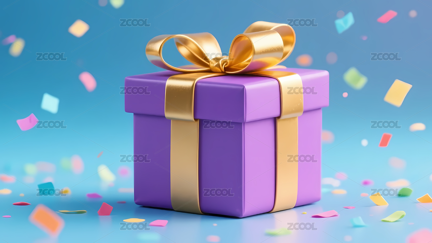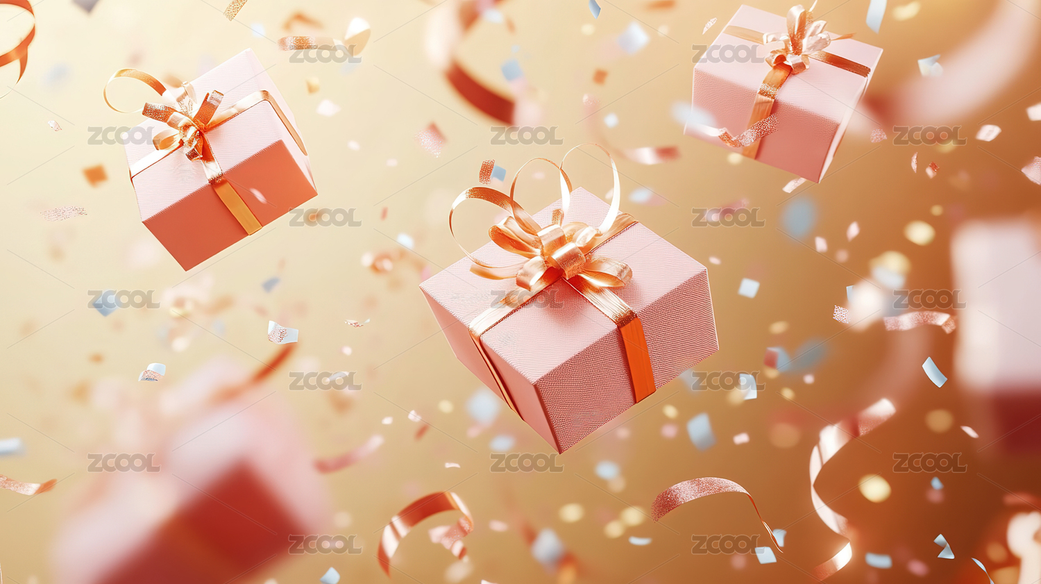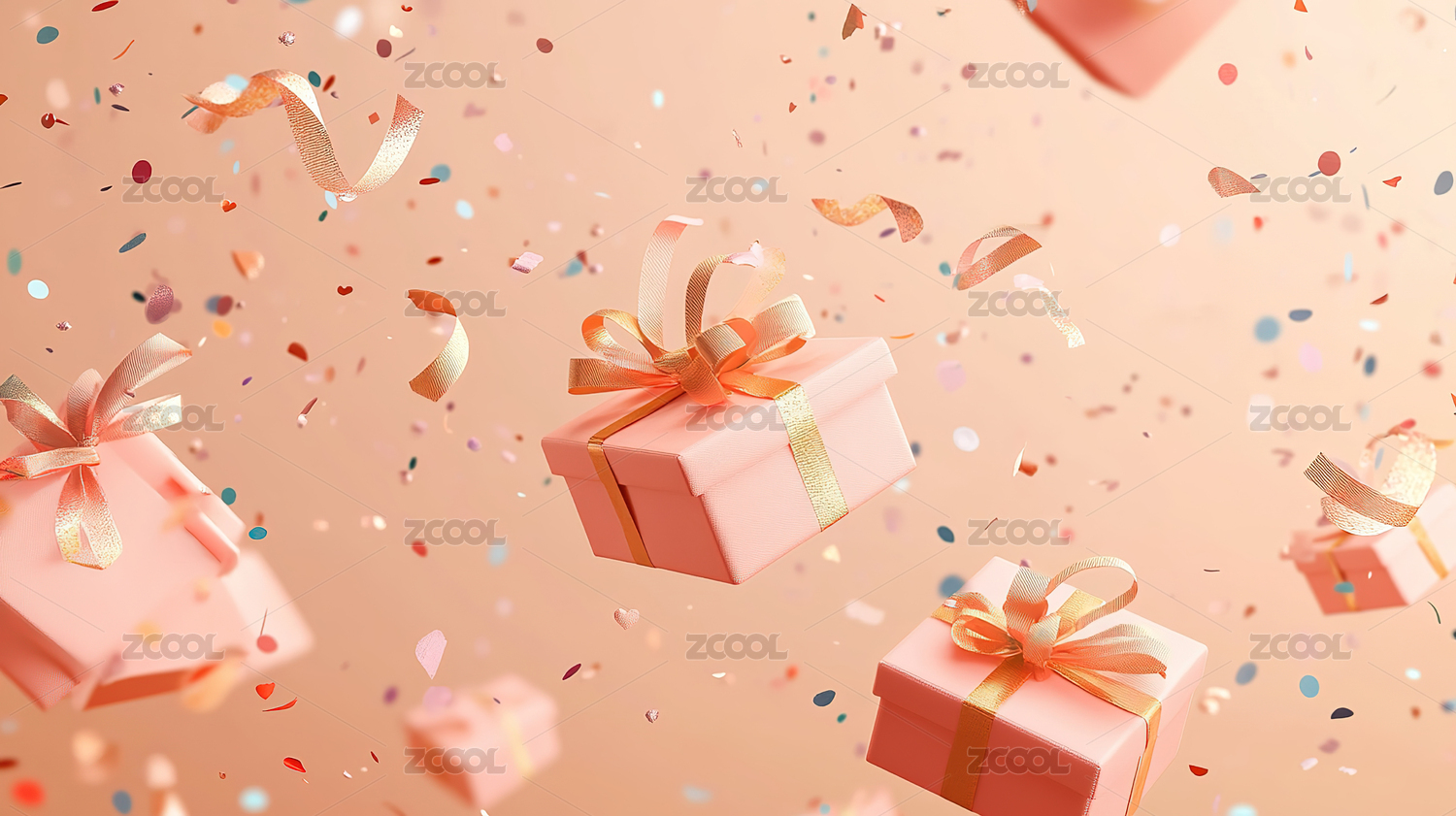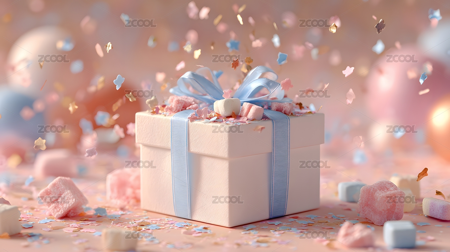 粉色礼物盒与蓝色丝带飘落彩色纸屑