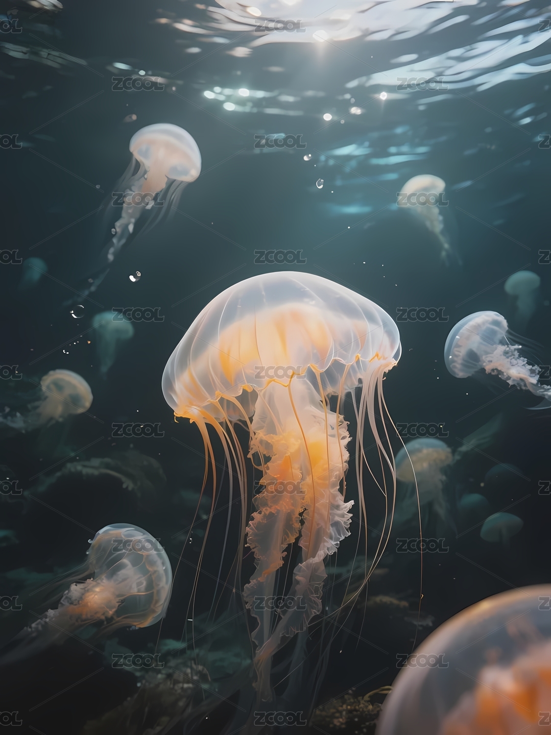 水下漂浮的透明水母群