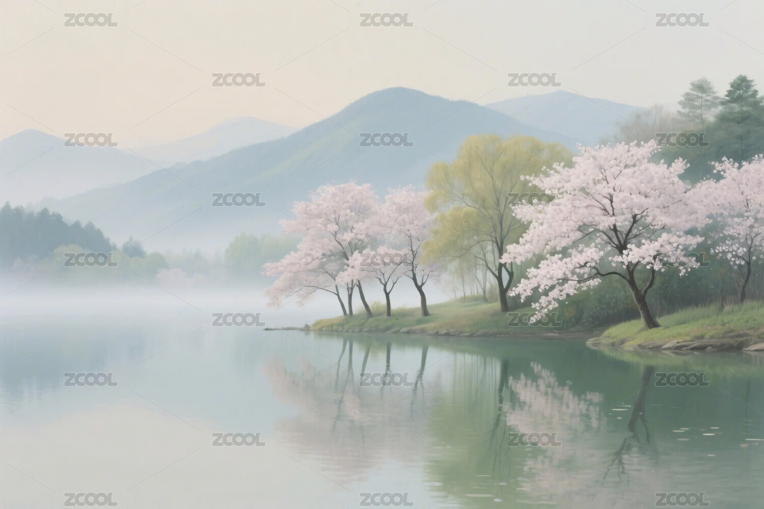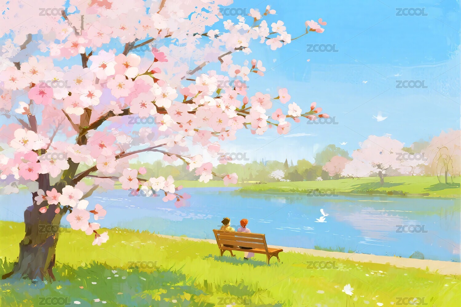 樱花湖畔春景插画