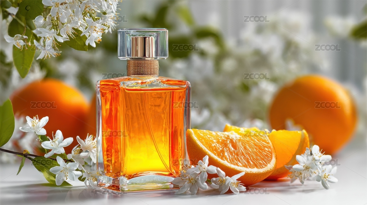 柑橘香水瓶与薄荷柑橘,清新香气氛围