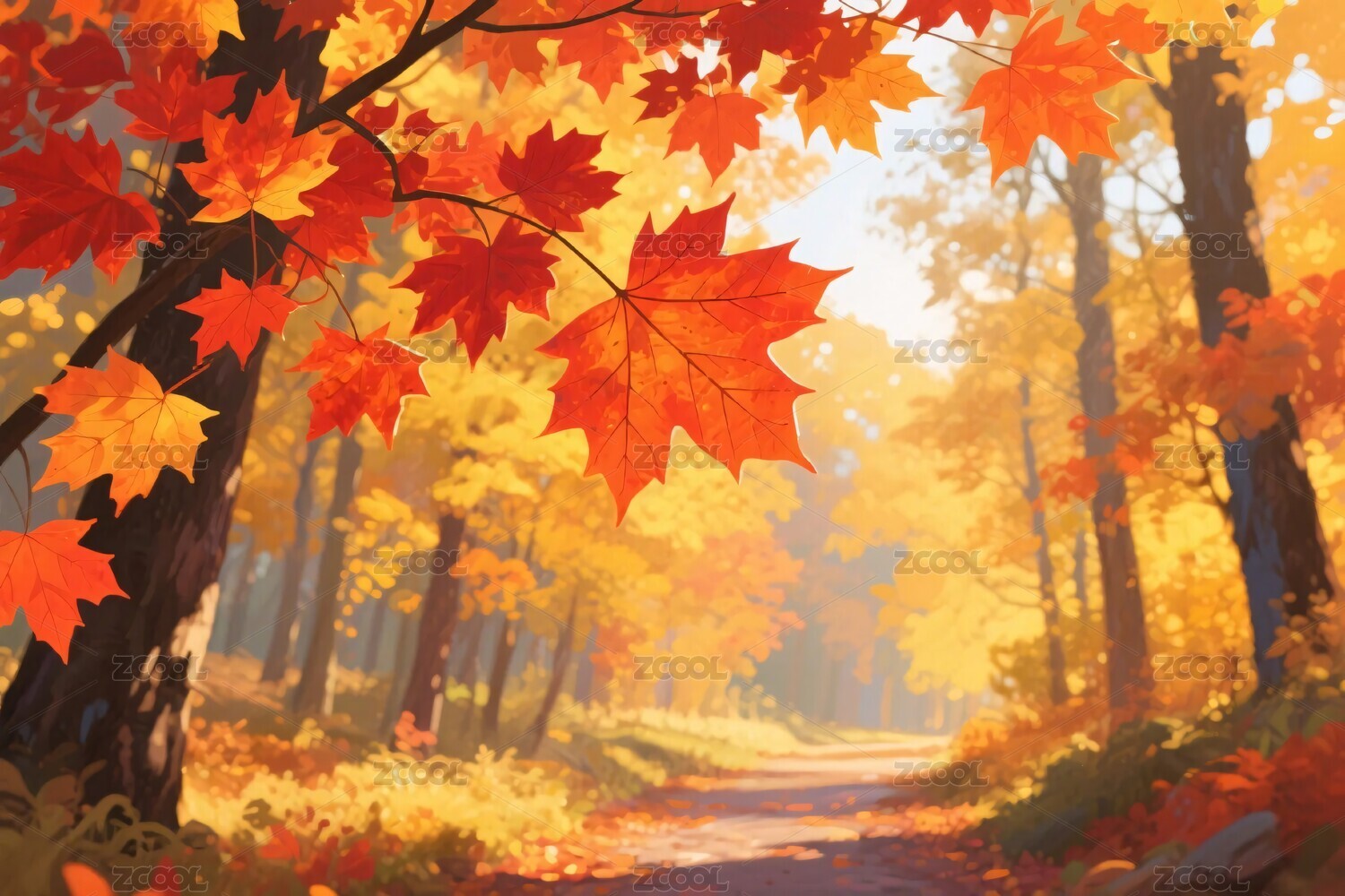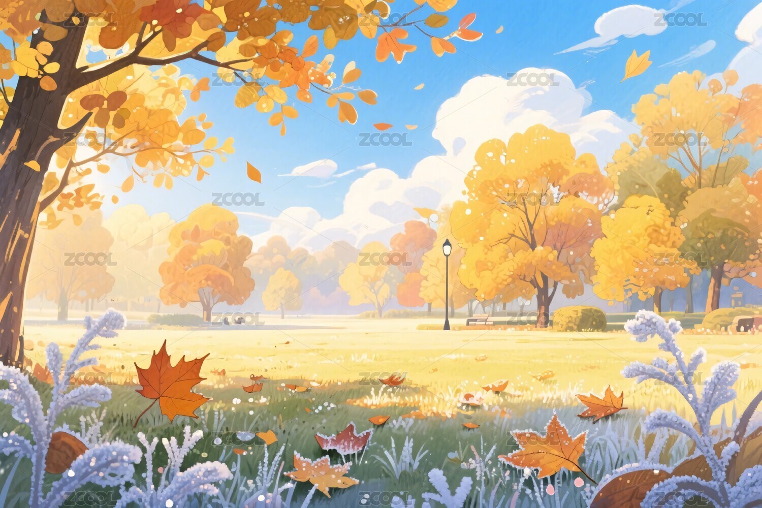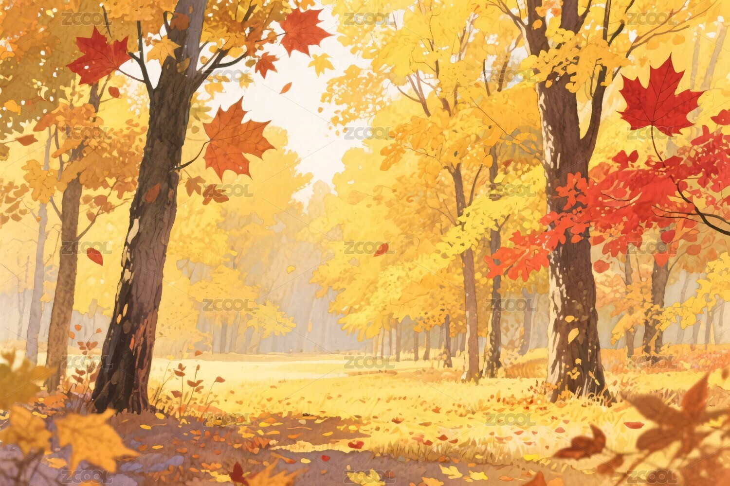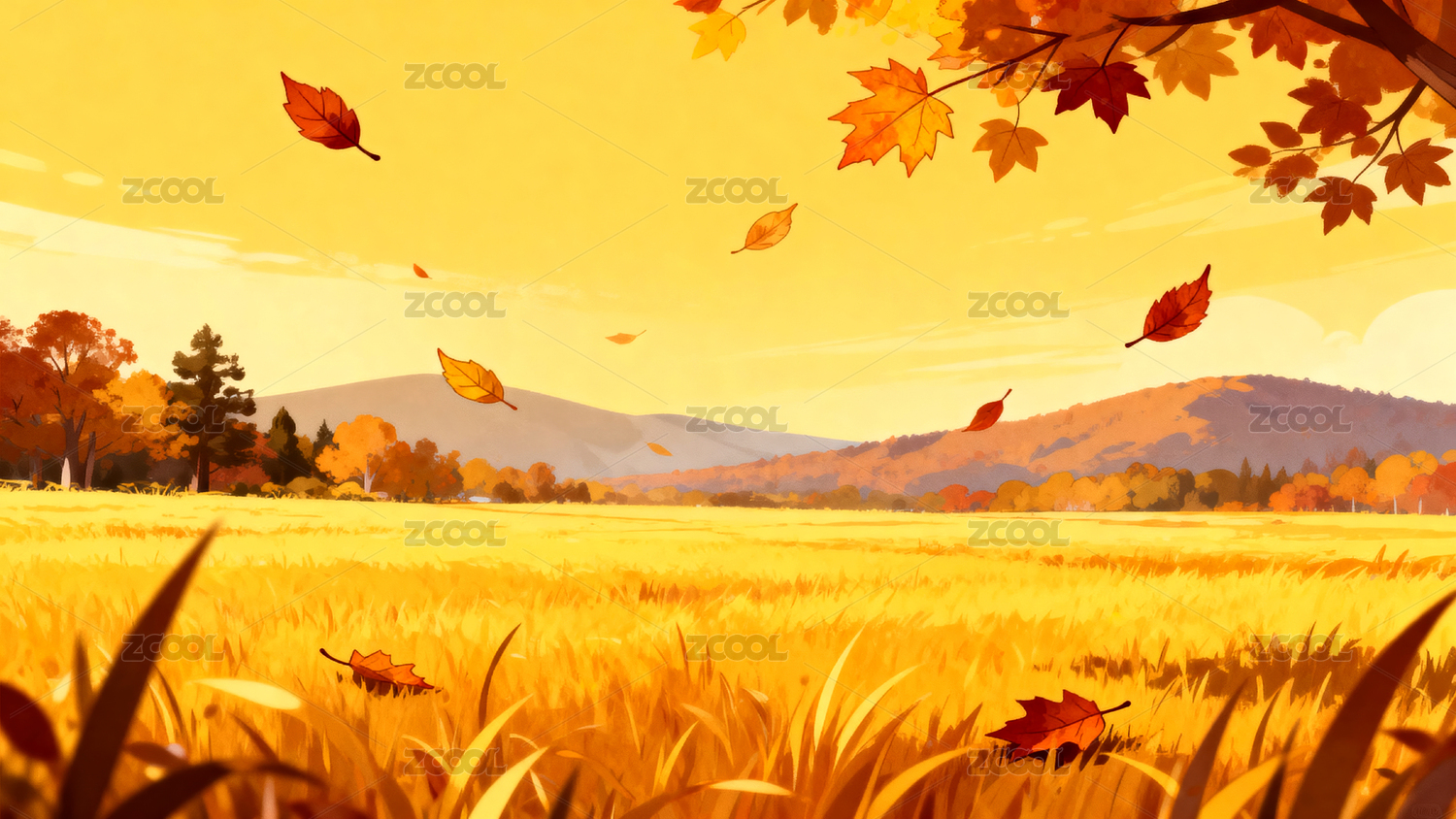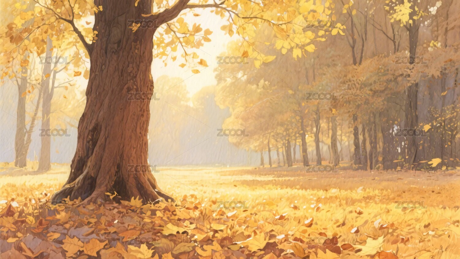 秋天,田野,大树,落叶,干草垛,插画,风景,自然,季节,乡村