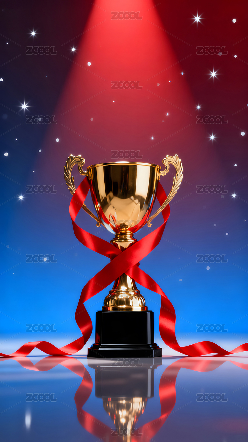 金色奖杯红色丝带蓝色背景