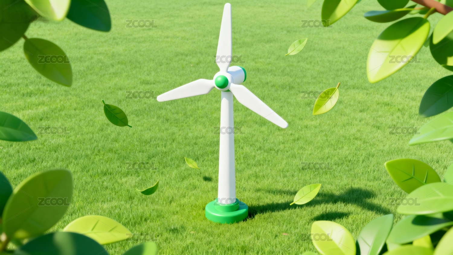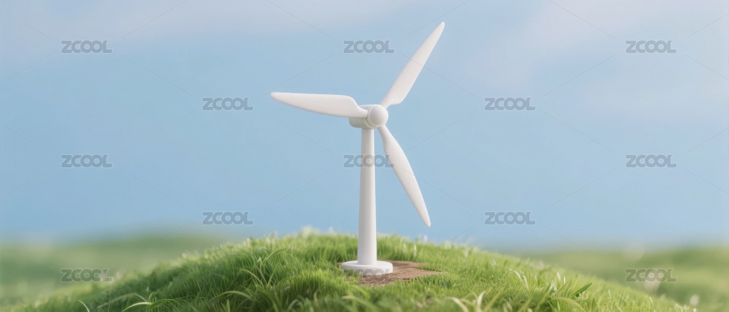 3D可爱风绿色草坪上的风力发电机