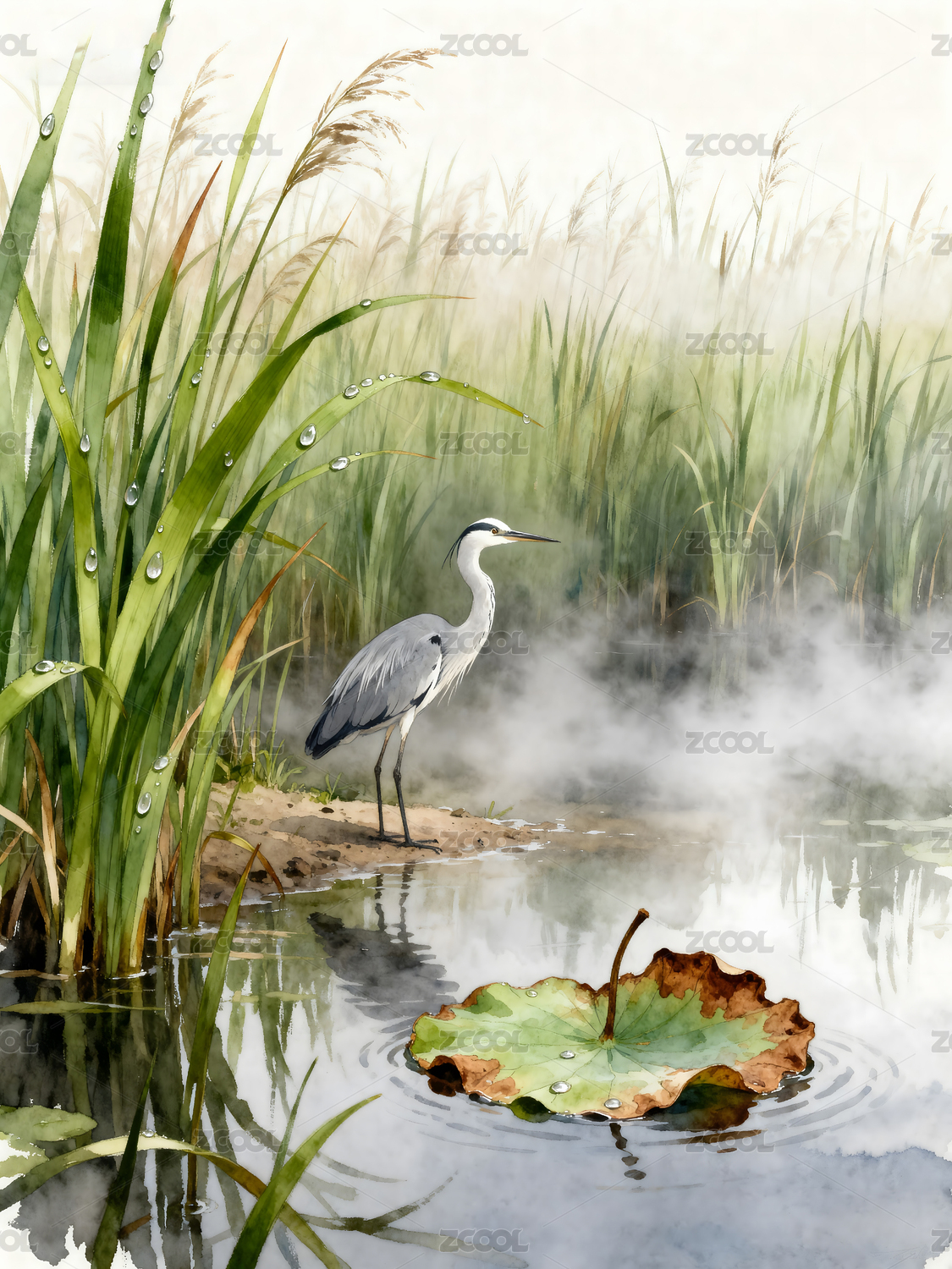 水墨画,秋天,节气,白鹭,白露,白昼,光影,插画,芦苇,水