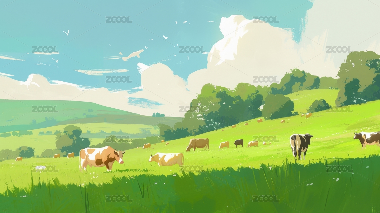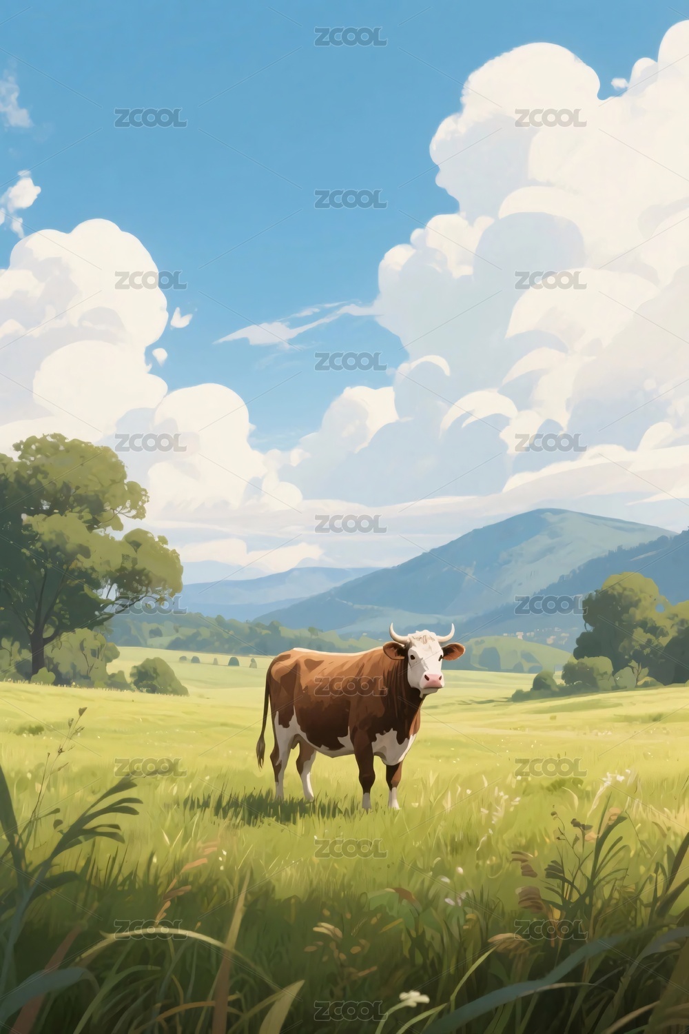 奶牛,草地,田野,风景,田园,插画,绘画,景色,山峦,植物