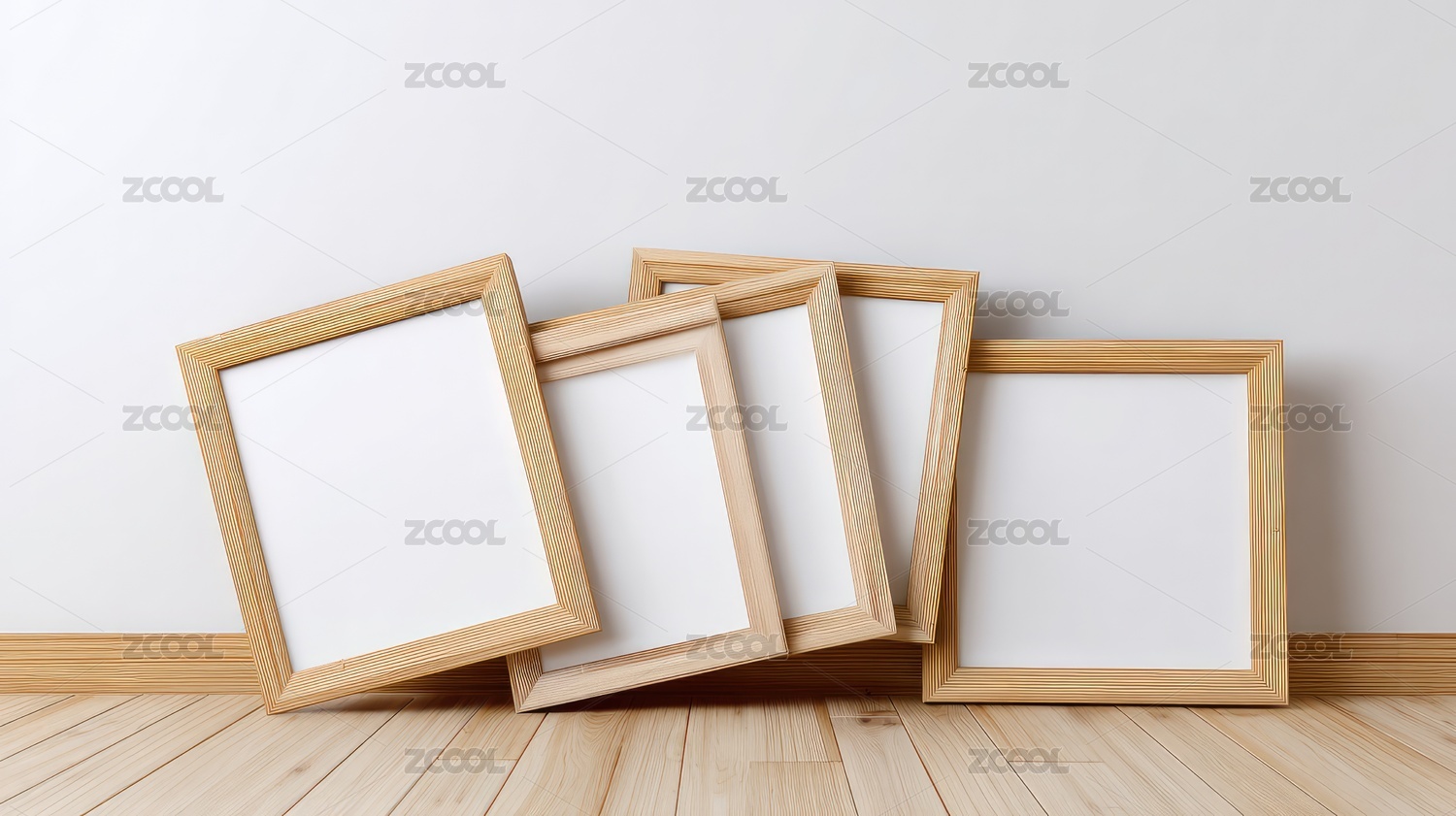 木画框斜挂在浅色橡木地板上阴影落在白墙上