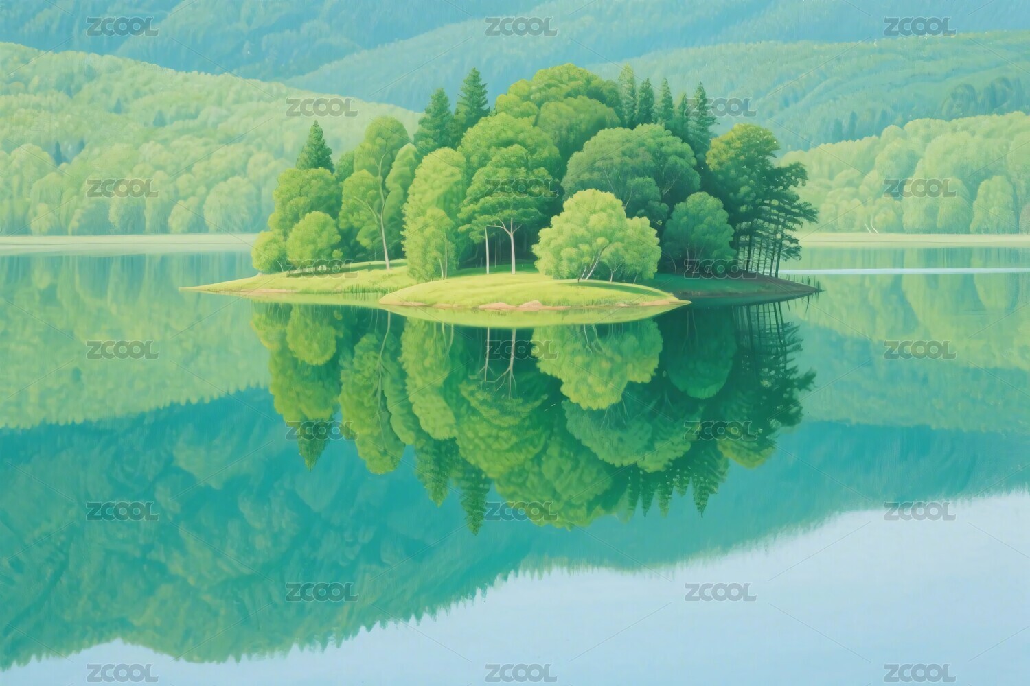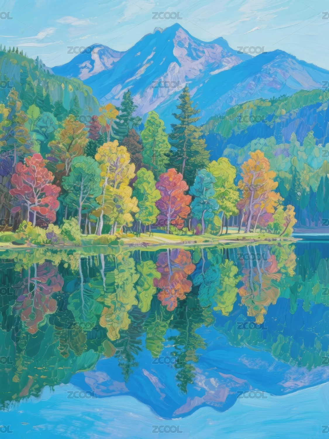 湖泊,树林,山峦,水彩画,风景,自然,宁静,山水,茂林,秋景