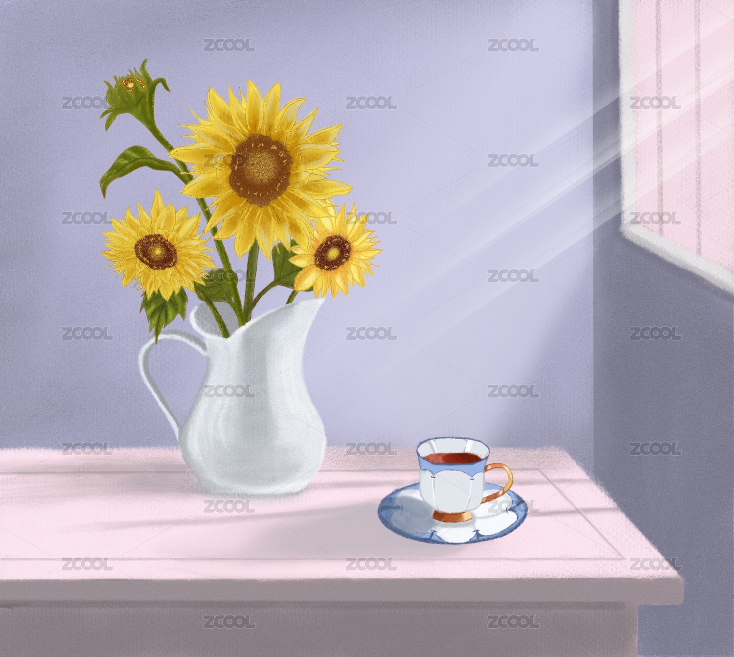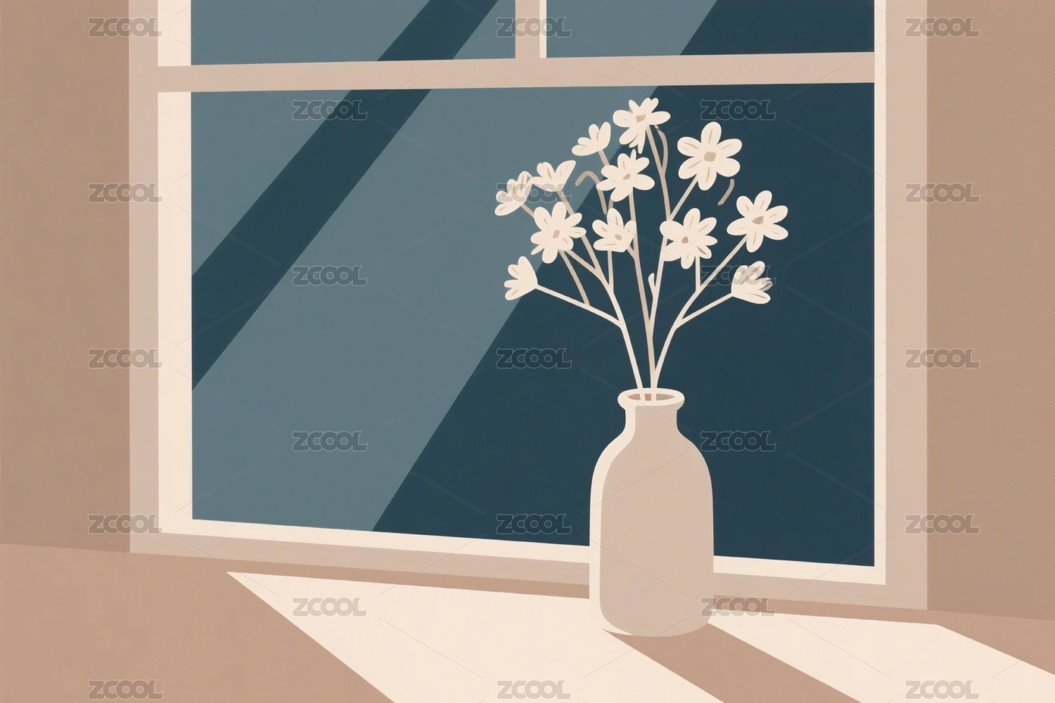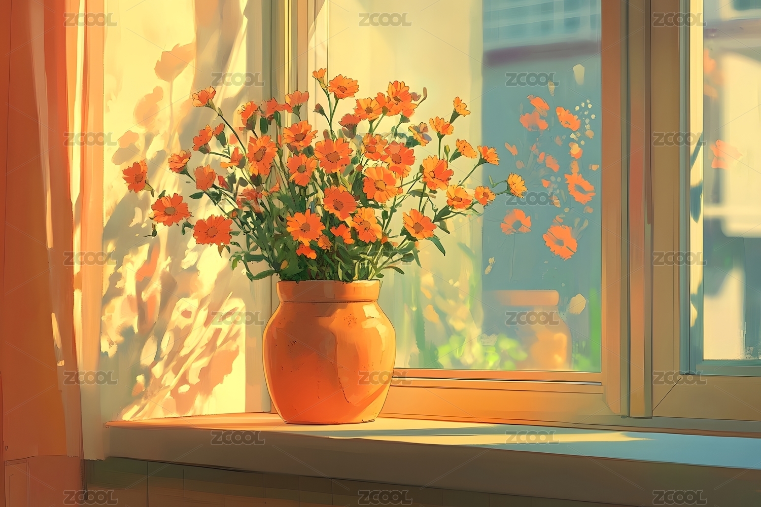 花瓶,鲜花,窗户,室内,插画,静物,装饰,花卉,插花,装饰画