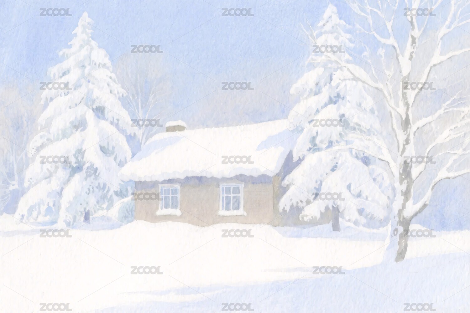 雪地,木屋,树木,雪景,冬日,风景,插画,冬季,寒林,冰封