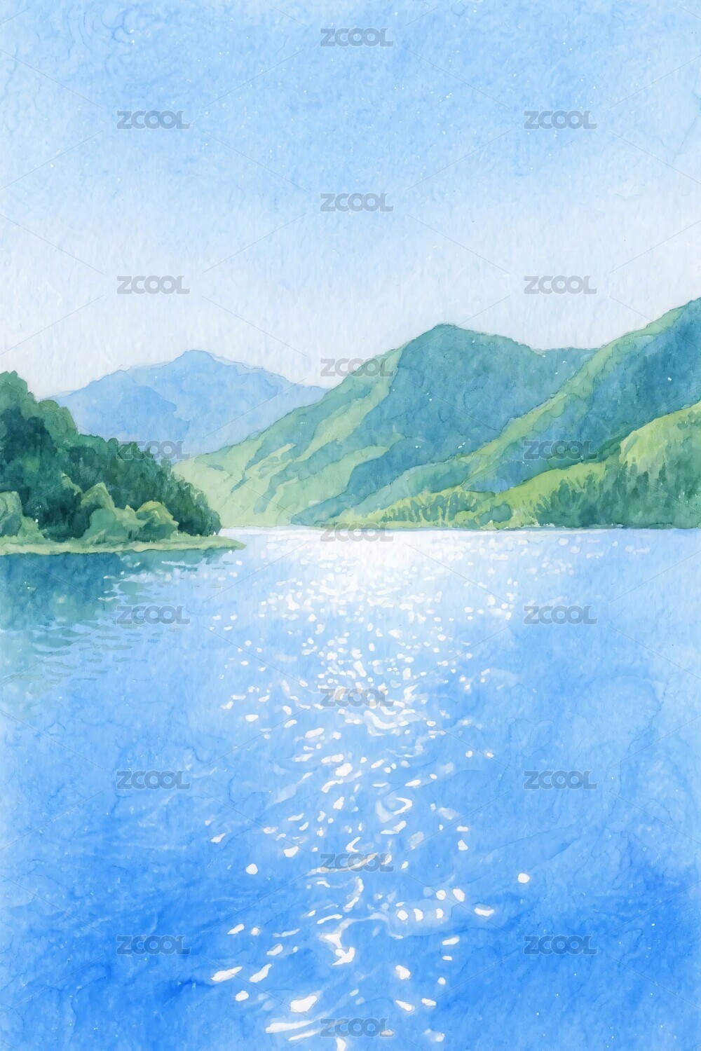山水湖泊水彩画
