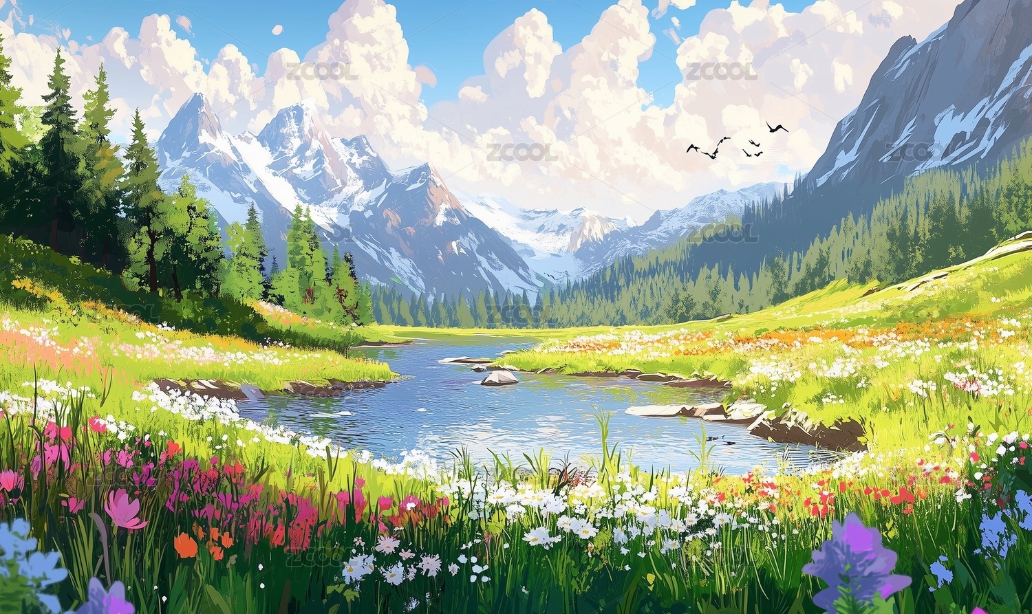 河流,青山,花草,树木,森林,阳光,山水,插画,自然,风景