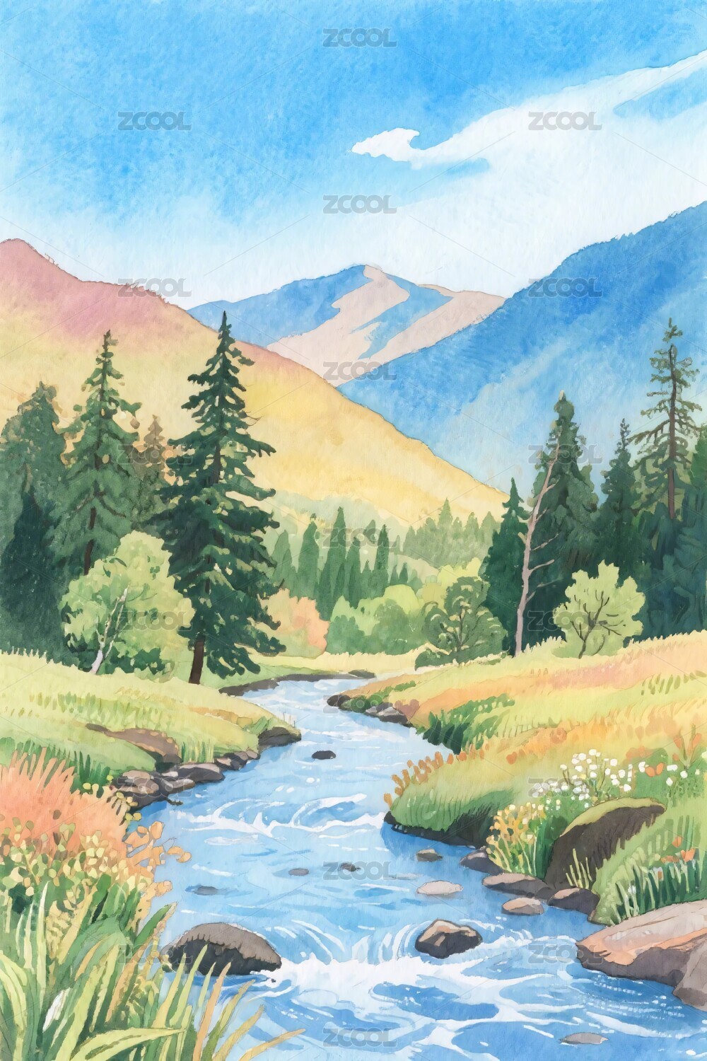 山间溪流风景画