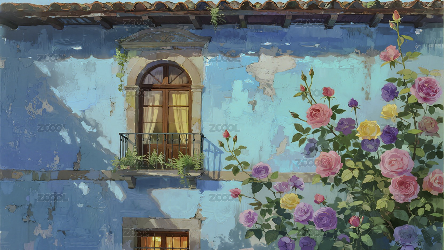 玫瑰,鲜花,房屋,窗户,建筑,阳台,植物,花卉,庭院,复古