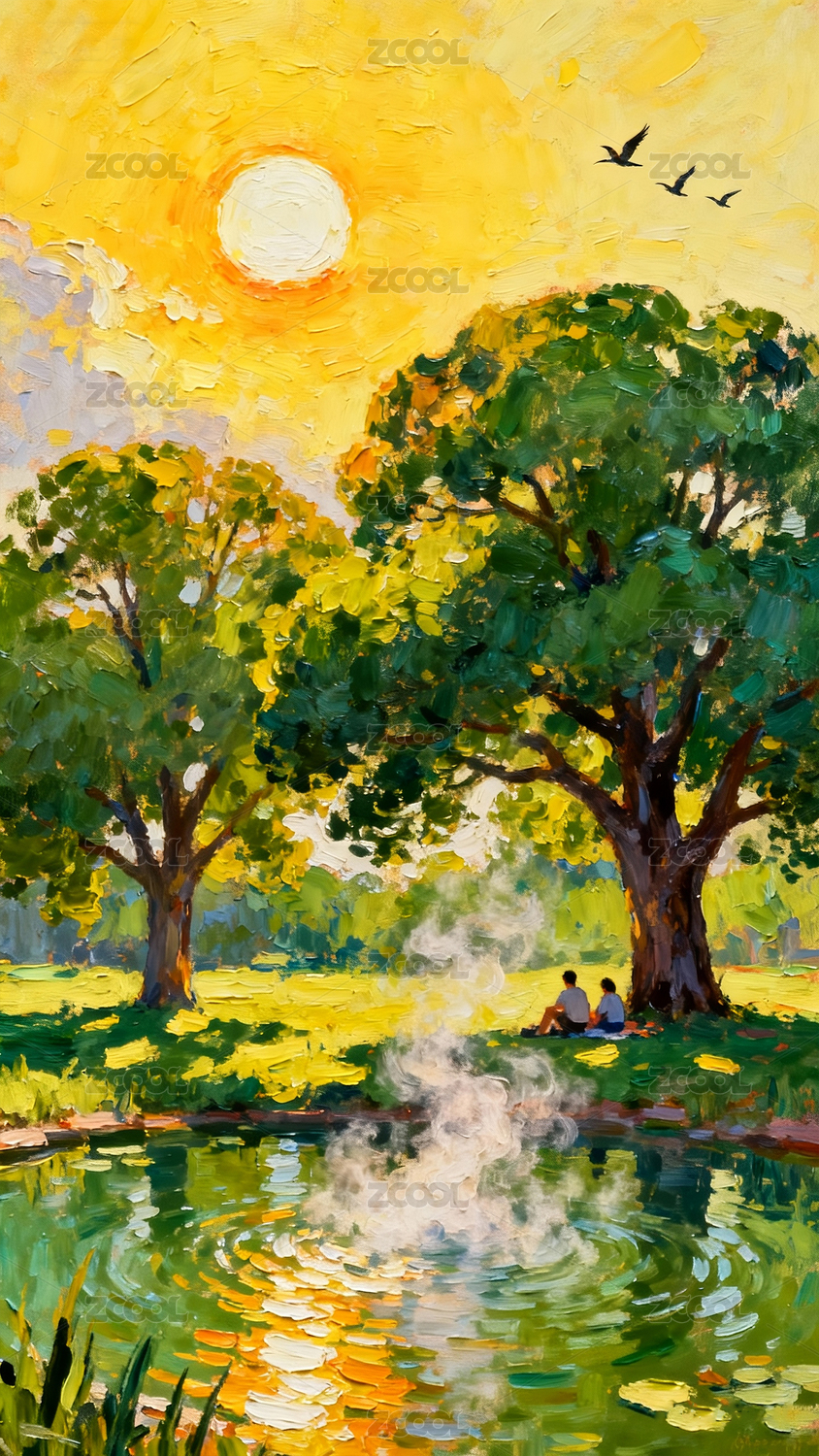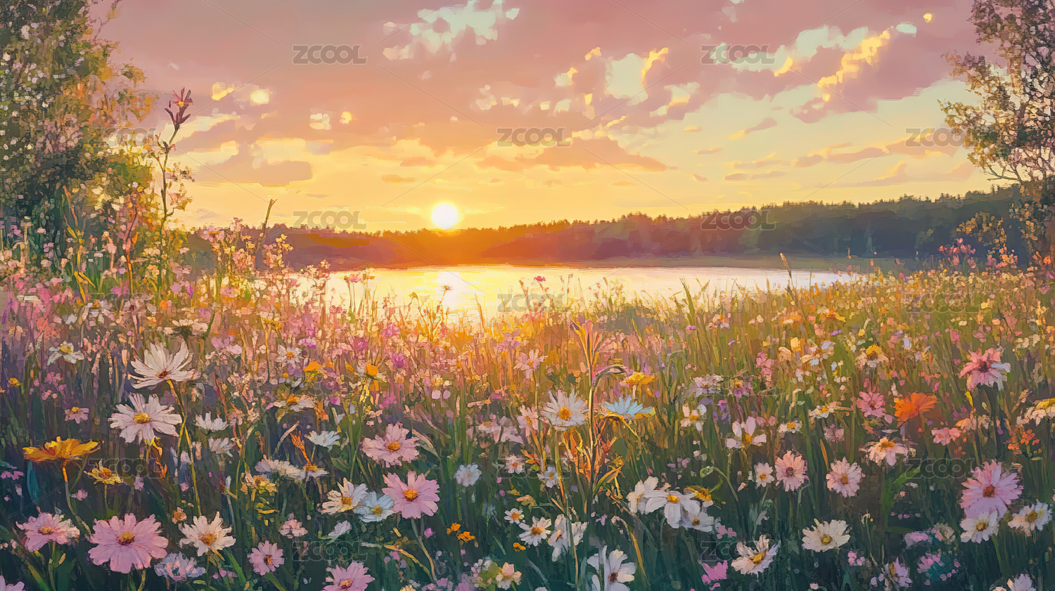 日落,蓝天,白云,湖泊,草地,植物,河流,风景,油画,自然